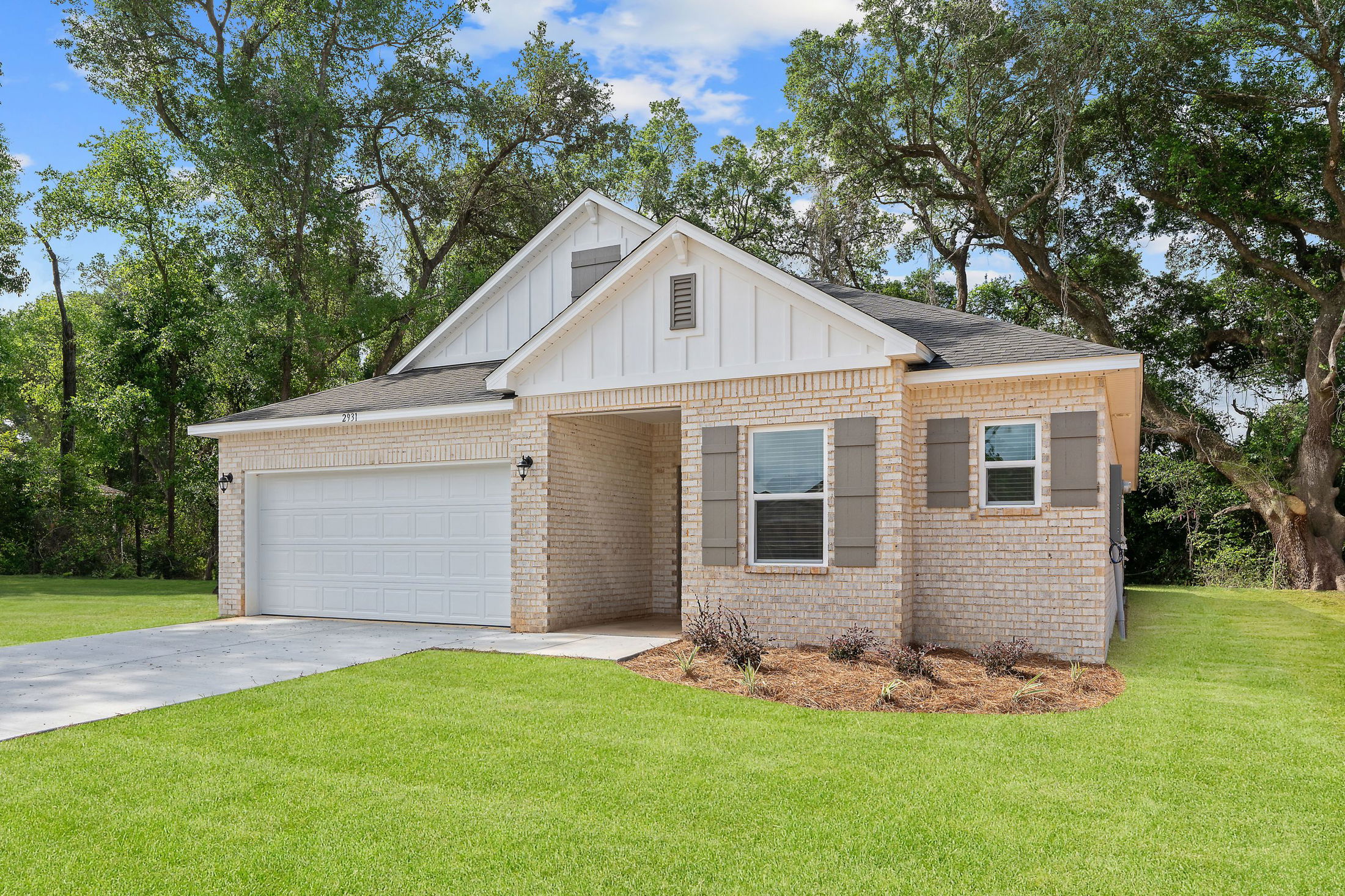 Modern single-story brick house with a two-car garage, manicured lawn, and clear blue sky.