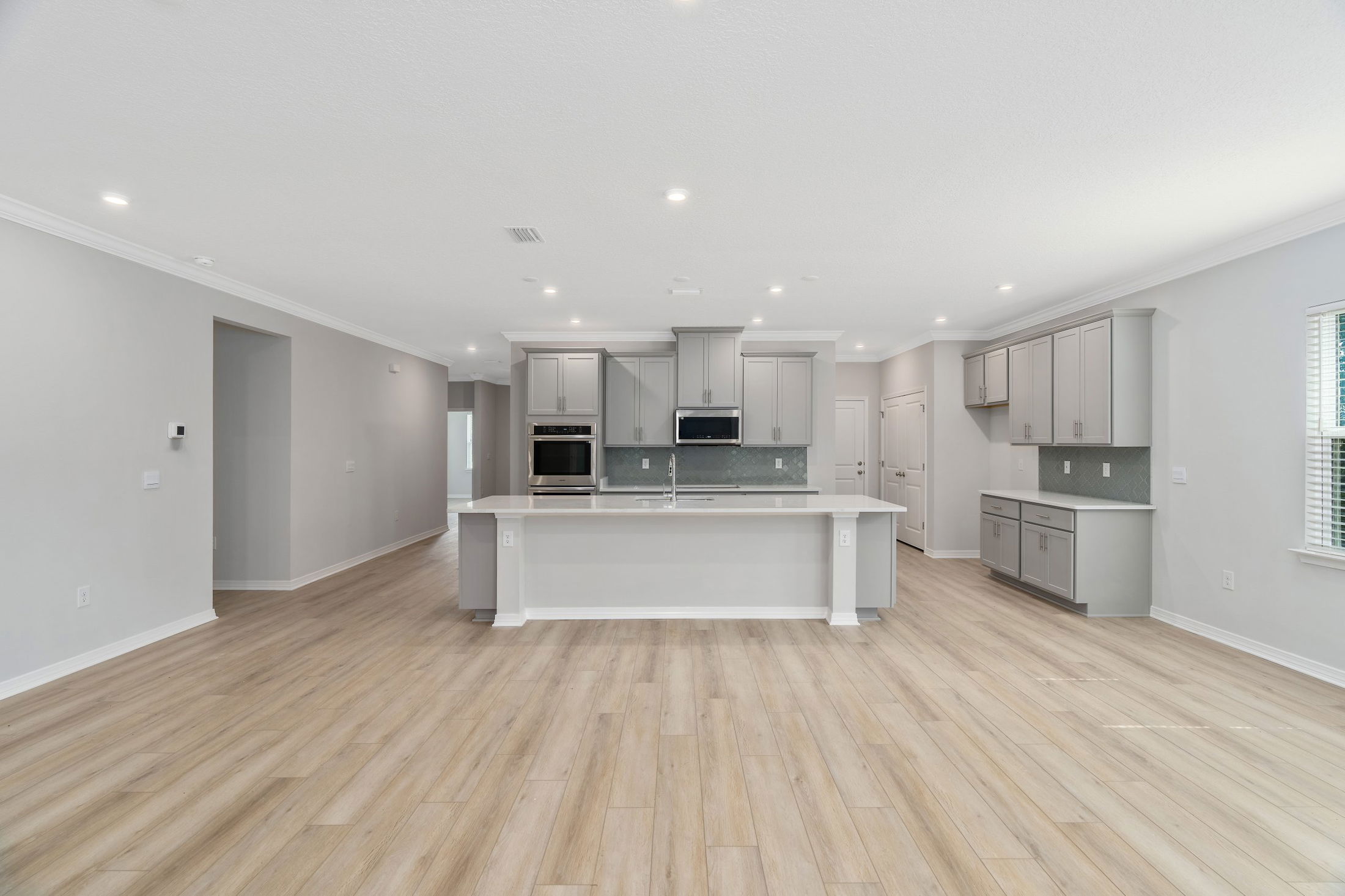 Step inside the foyer and follow the hallway past the second and third bathrooms to the open living area—designed for effortless family living. The island kitchen includes a convenient eating bar, perfect for casual meals and gatherings. Nearby, the breakfast nook offers a sunny spot to start your day.