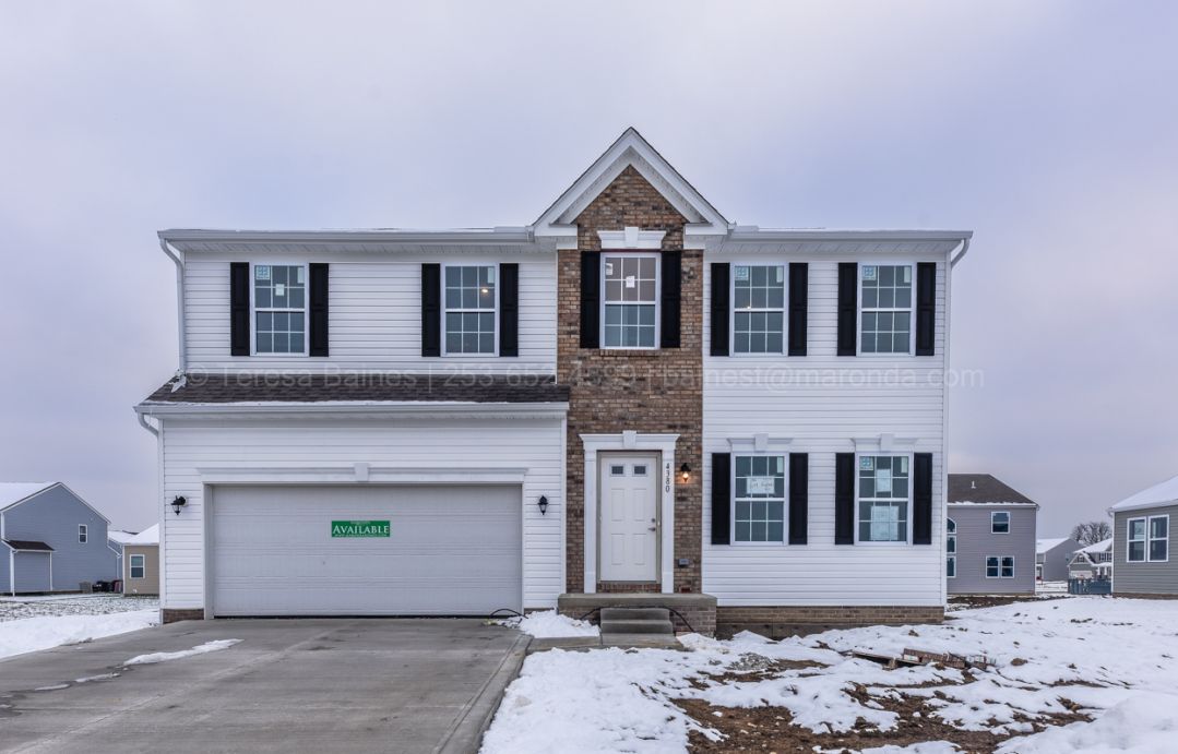 Two-story suburban house with gray siding, brick accents, and a double garage, set against a blue sky backdrop.