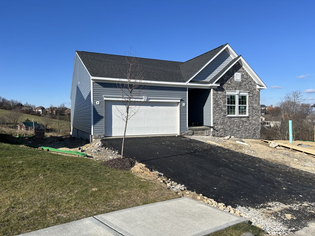 Modern single-story home with stone facade, three-car garage, and spacious driveway under a clear blue sky.