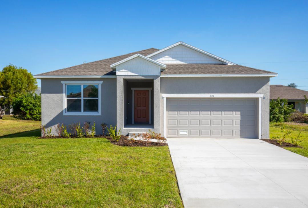 Newly built single-story home with a well-kept lawn, white siding, and a spacious two-car garage under a clear blue sky.