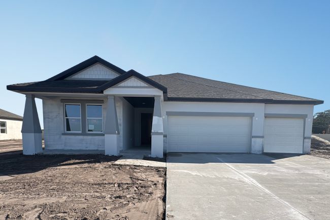 A modern single-story suburban house with a stone facade, landscaped front yard, and spacious driveway under a clear blue sky.