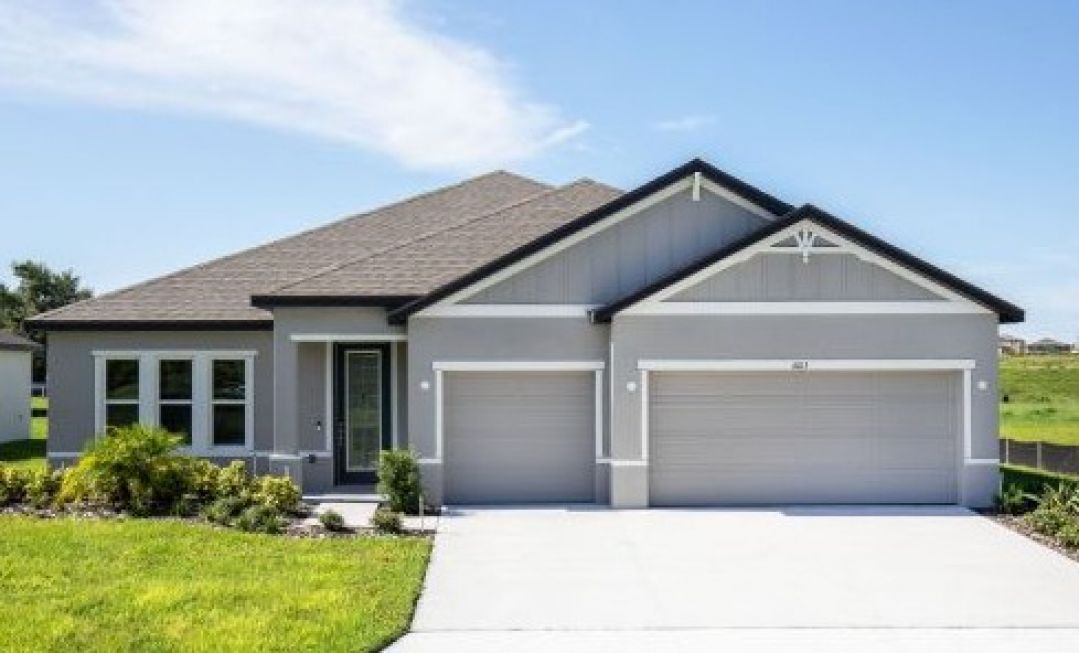 Modern single-story home with a two-car garage and manicured lawn under a partly cloudy sky.