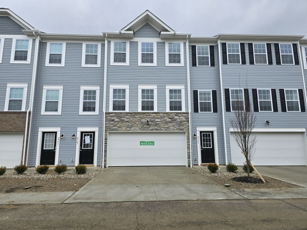 Modern two-story suburban home with gray siding, white trim, and attached garage.
