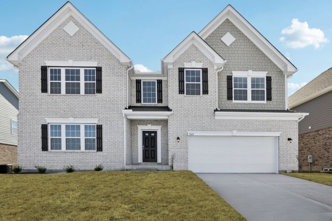 Two-story suburban house with gray siding, brick accents, and a double garage, set against a blue sky backdrop.
