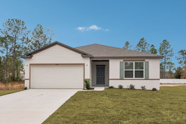 Modern single-story suburban home with a two-car garage, surrounded by a well-maintained lawn and tall trees.