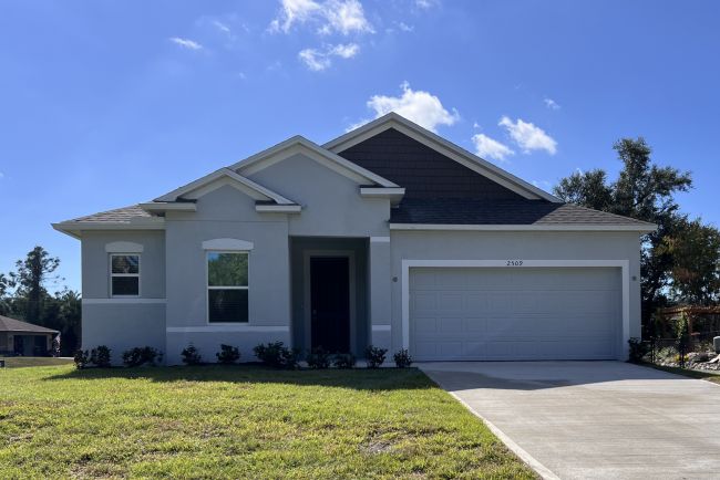 Single-story gray house with a spacious front lawn and two-car garage, set against a clear blue sky.