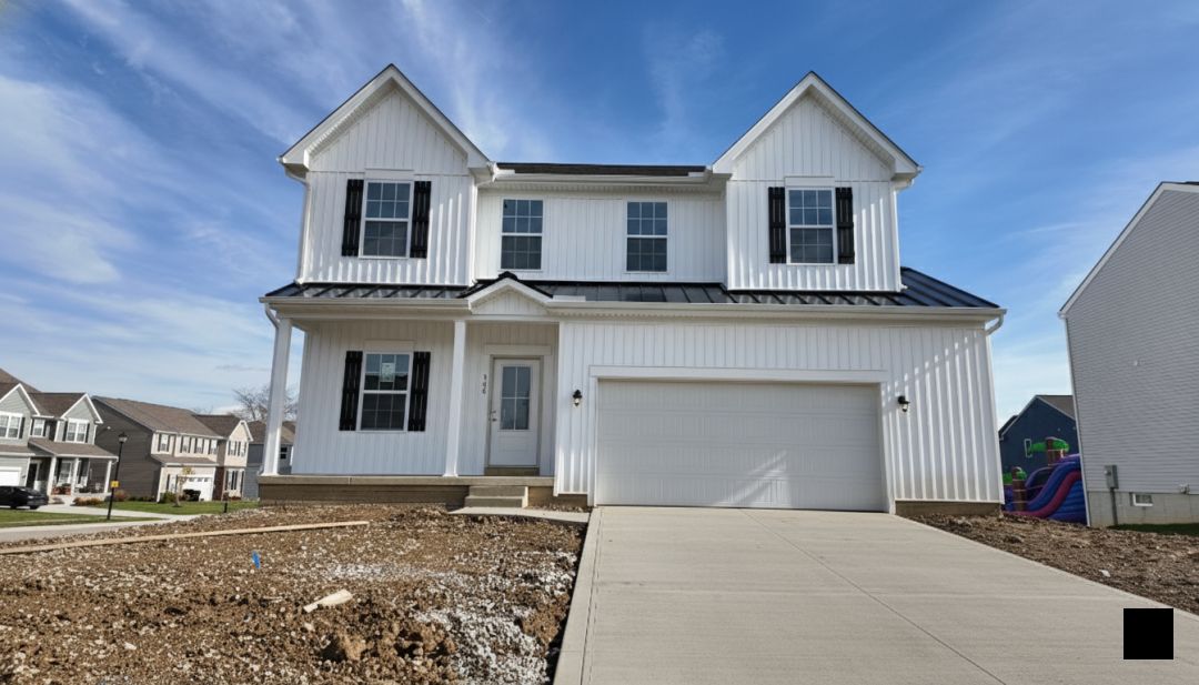 Modern two-story suburban home with gray siding, white trim, and attached garage.