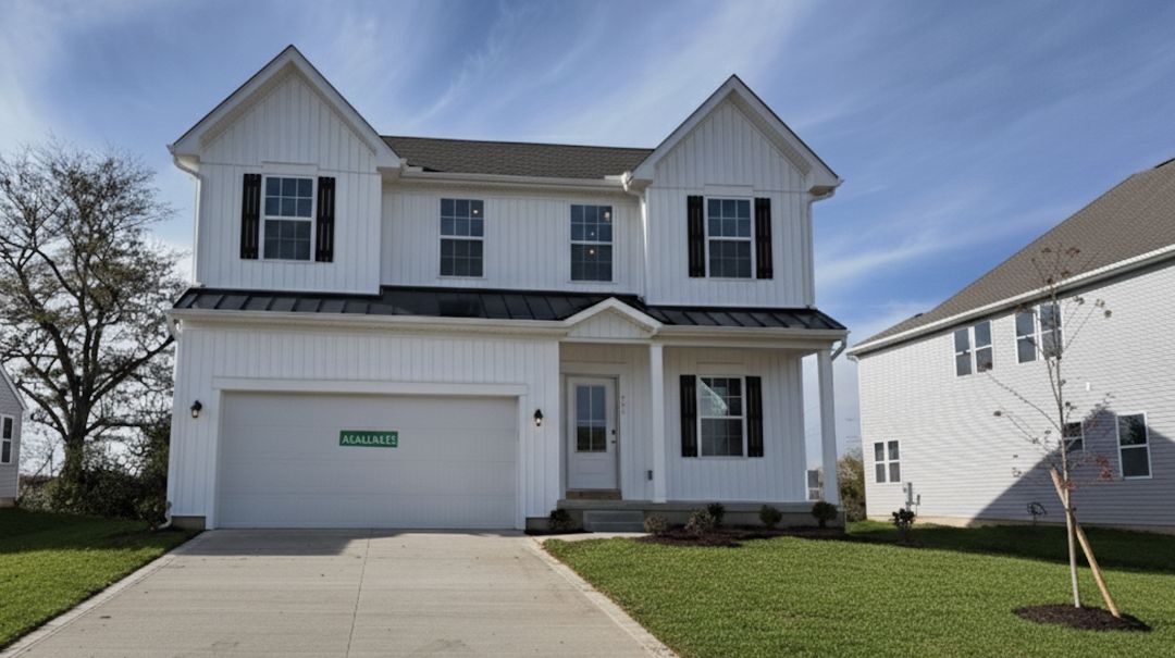 Modern two-story house with brick and siding exterior, featuring a double garage and manicured lawn.