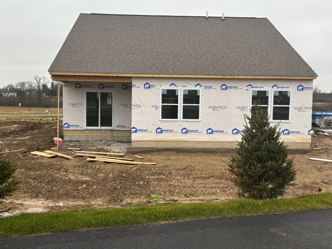 Newly built single-story home with a well-kept lawn, white siding, and a spacious two-car garage under a clear blue sky.
