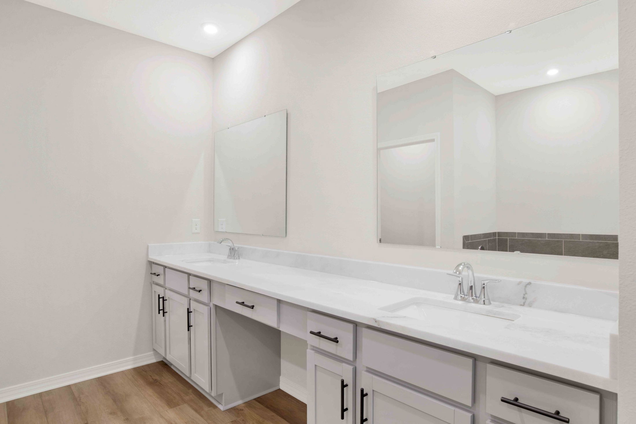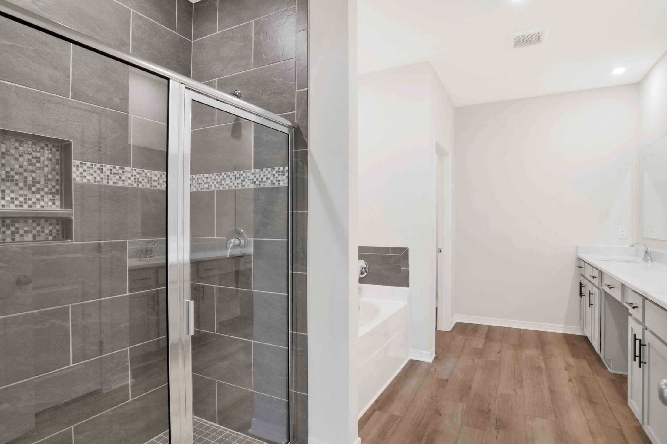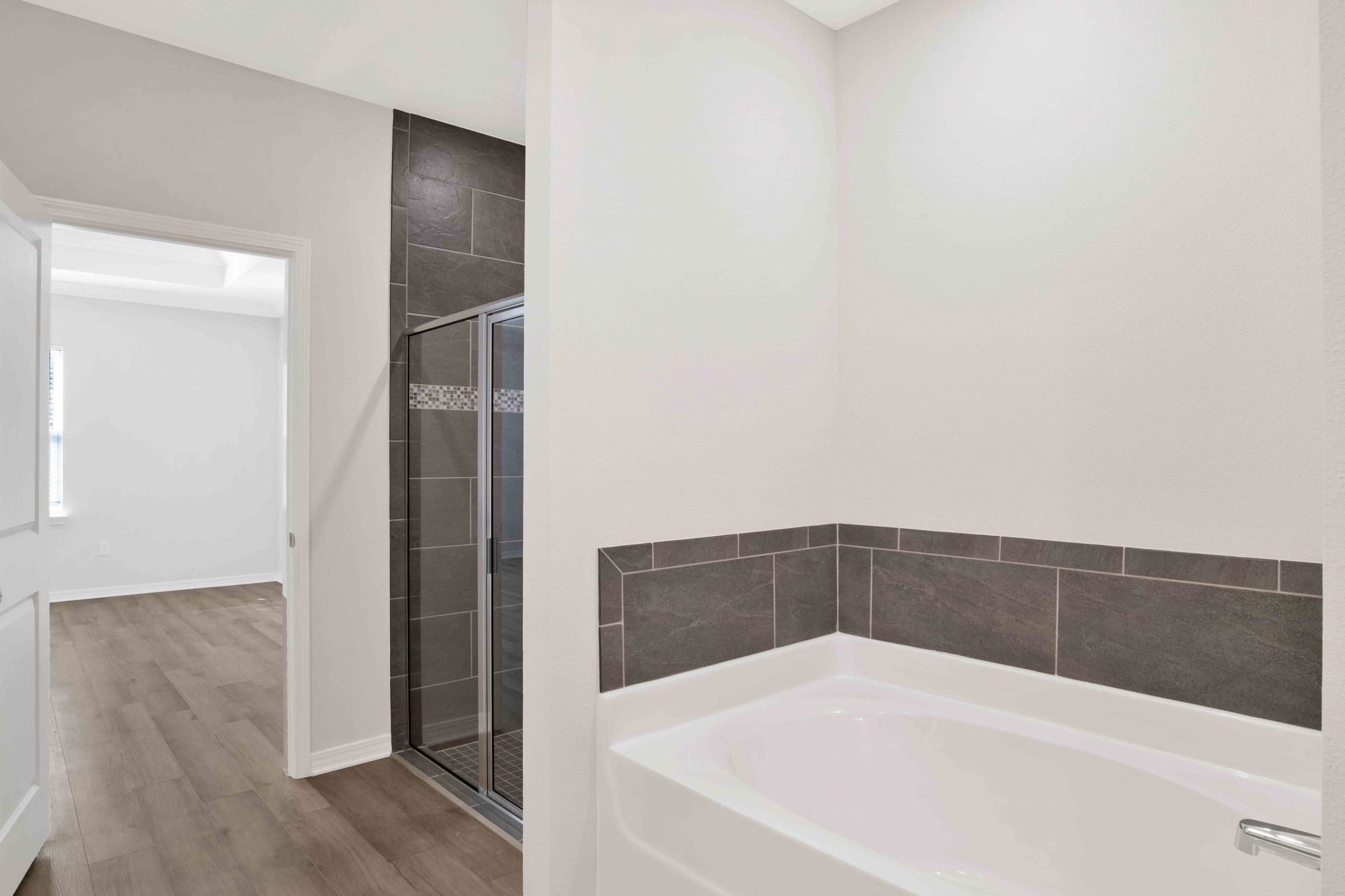 The master suite, tucked privately at the rear, offers a peaceful retreat complete with a spa-inspired bathroom, dual vanity, separate soaking tub and shower, and a perfectly placed linen closet for added convenience.