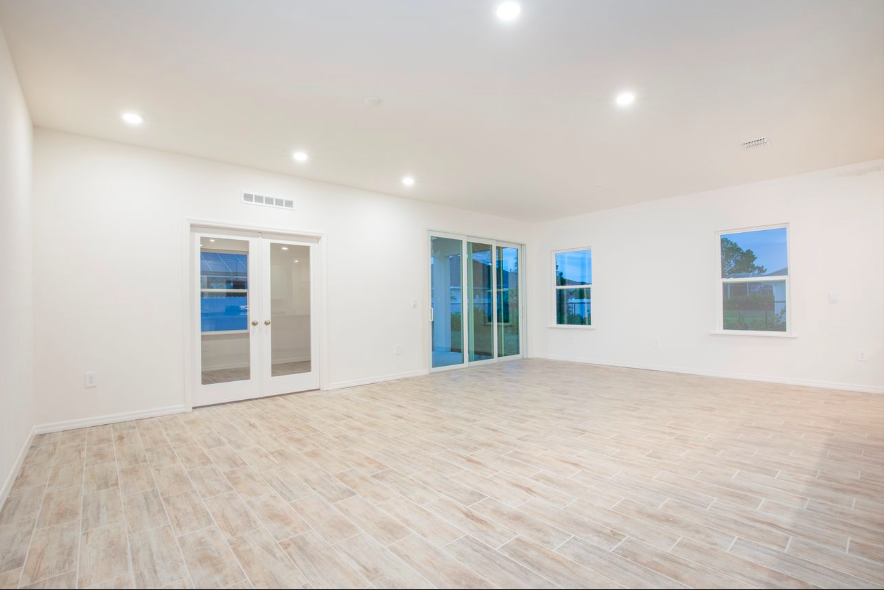 Spacious modern kitchen and living area with light-colored cabinets and tiled flooring in a newly built home.