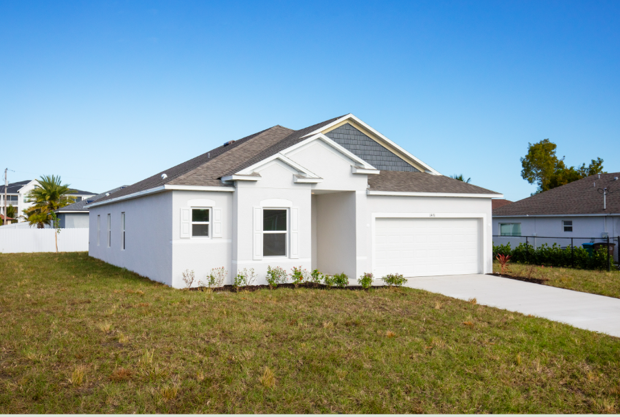 Newly constructed single-family home featuring a white exterior, blue accents, and a landscaped front yard.