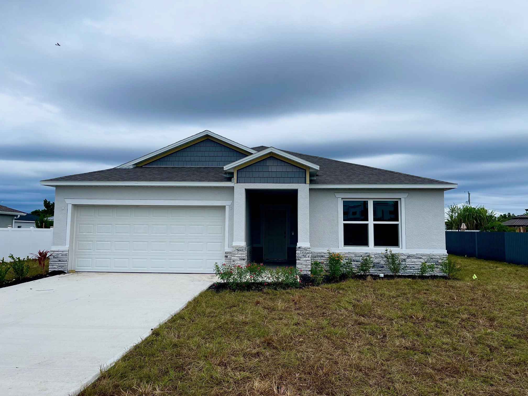 Modern single-story home with three-car garage, light grey exterior, and landscaped front yard.