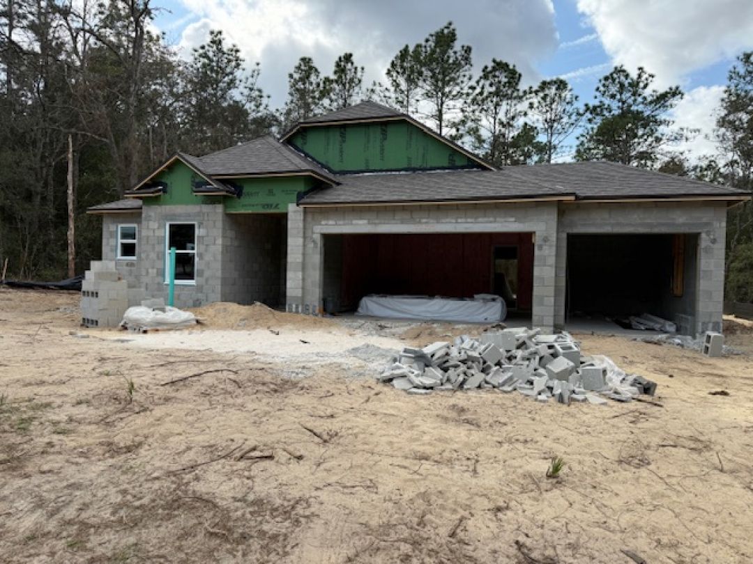 A newly constructed single-story grey house with a two-car garage and unfinished landscaping under a cloudy sky.