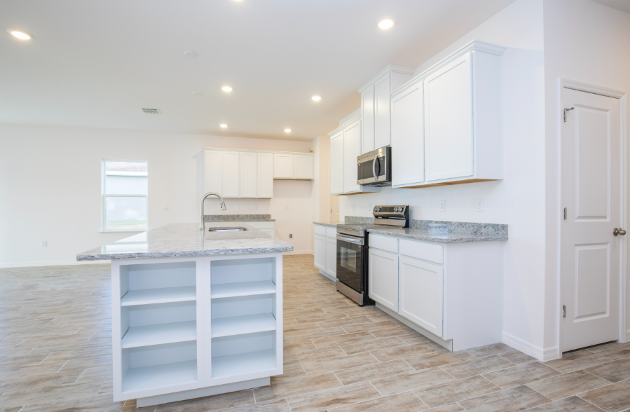 Modern kitchen interior with white cabinets, granite countertops, and stainless steel appliances.