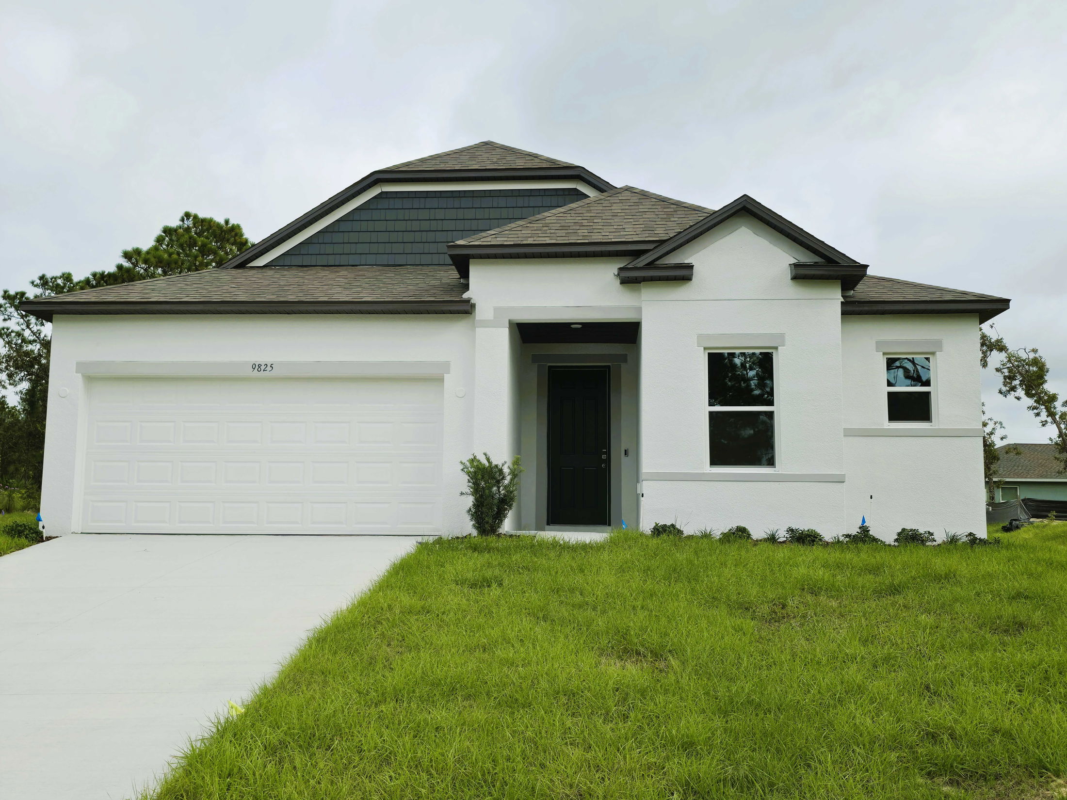 Single-story suburban home with a two-car garage and manicured lawn under a clear blue sky.
