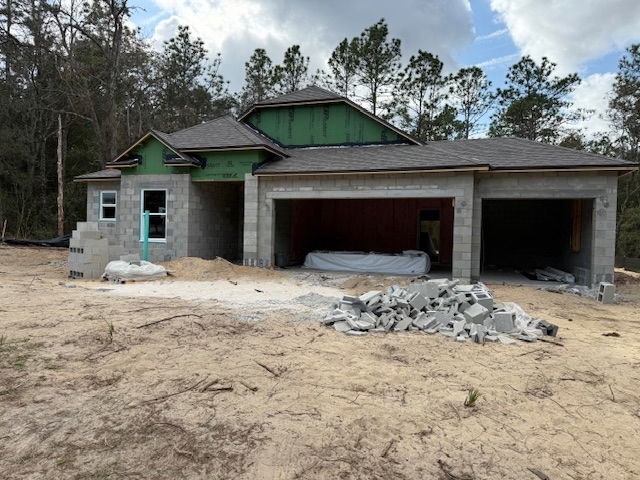 Modern suburban home under construction with cloudy sky background.