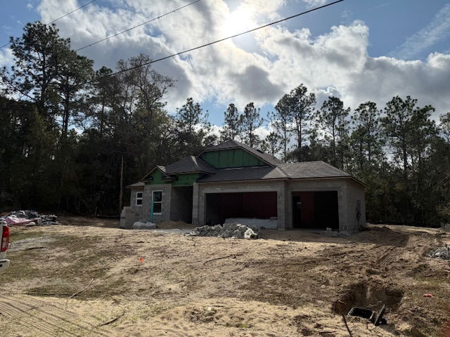 A newly constructed single-story grey house with a two-car garage and unfinished landscaping under a cloudy sky.