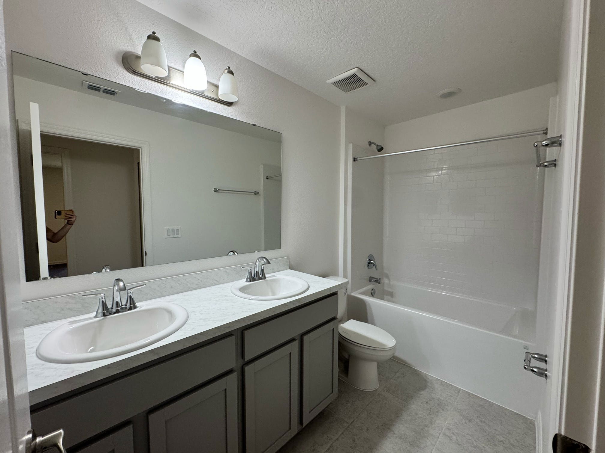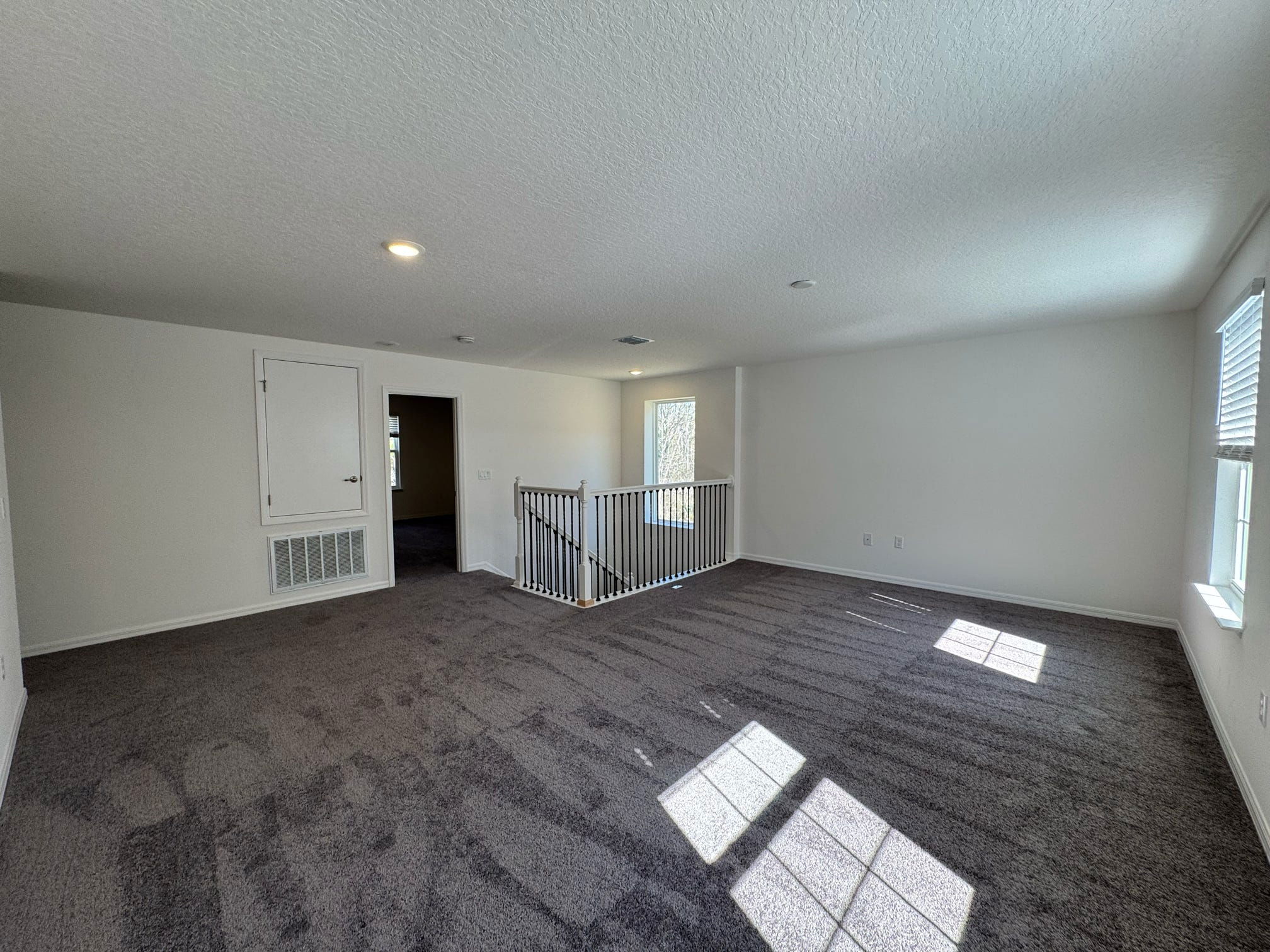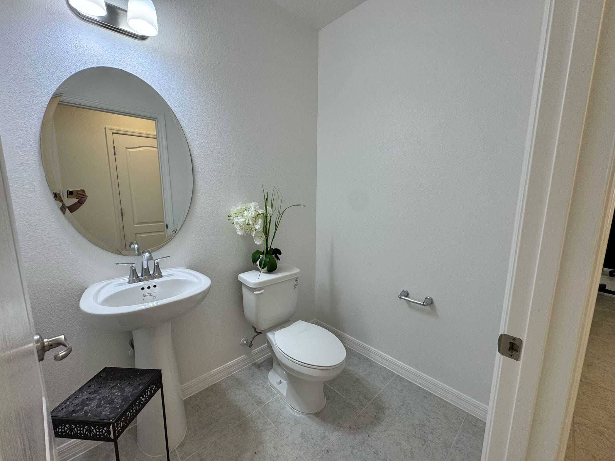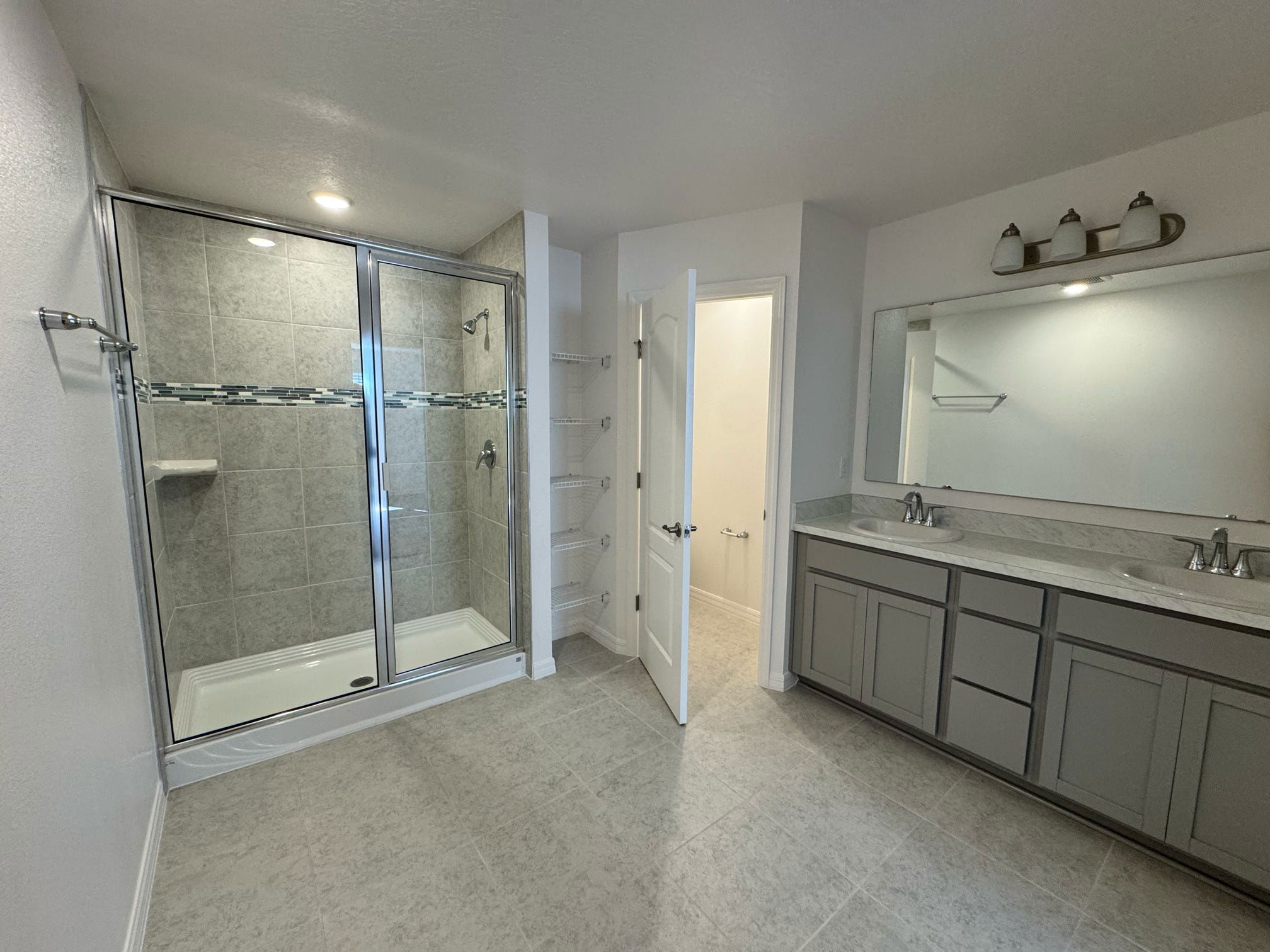 Inside, the home features elegant tile flooring throughout the first floor that extends to the bathrooms and laundry area upstairs. The residence boasts a large upstairs flex space perfect for a home office or entertainment room, enhanced by distinctive wrought iron spindles on the staircase. The master suite opens through French doors and includes a beautifully tiled shower with a sleek glass enclosure.
