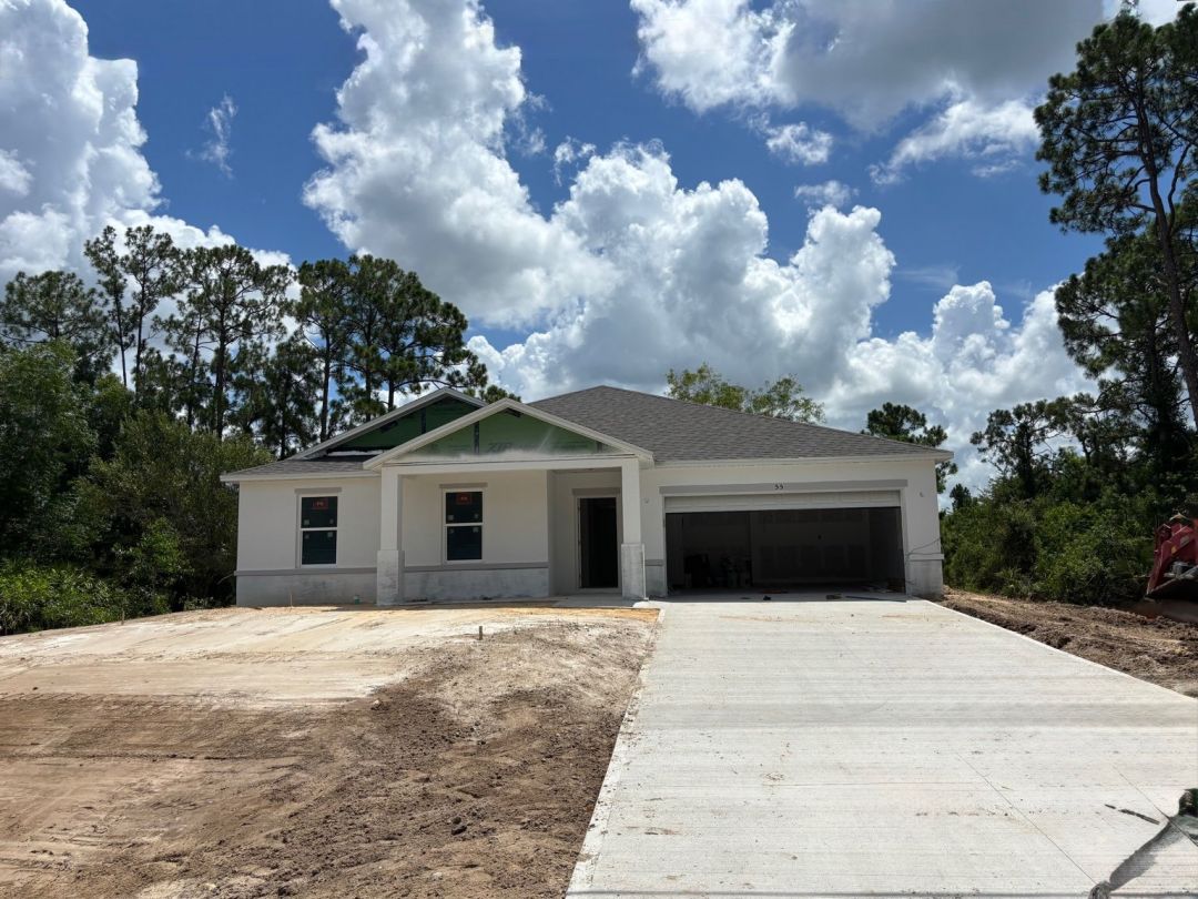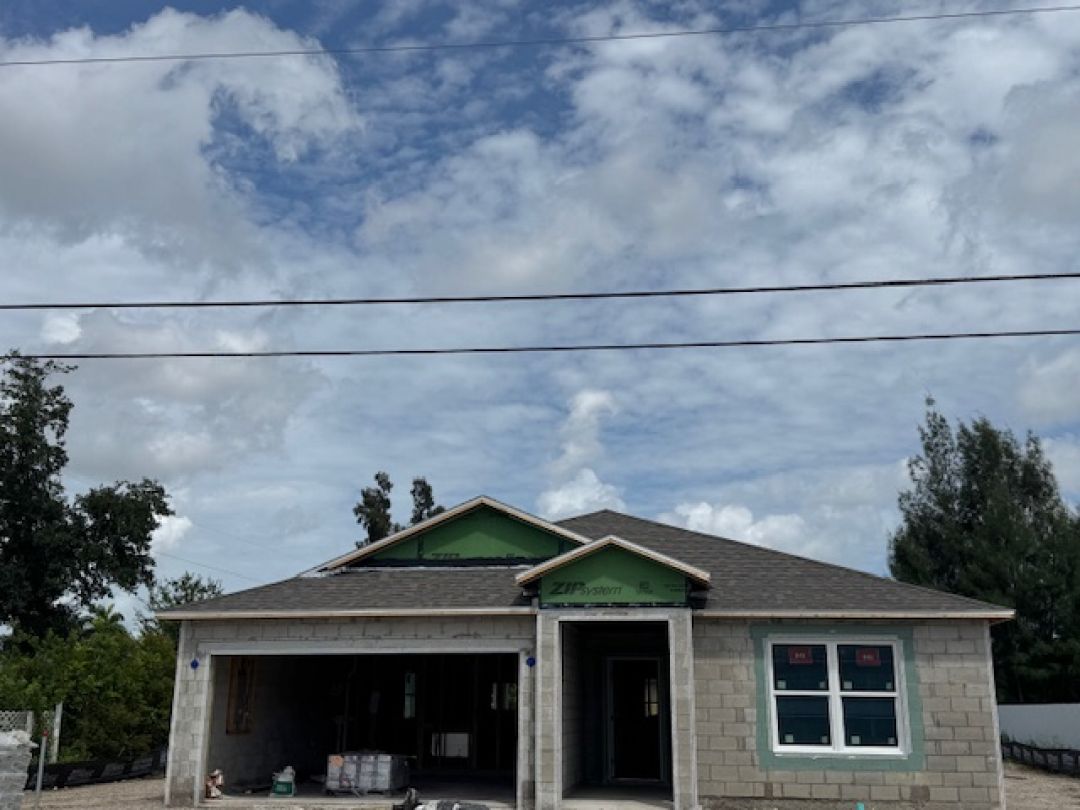 Partially constructed single-story house with cement block walls and unfinished roof on a clear day.