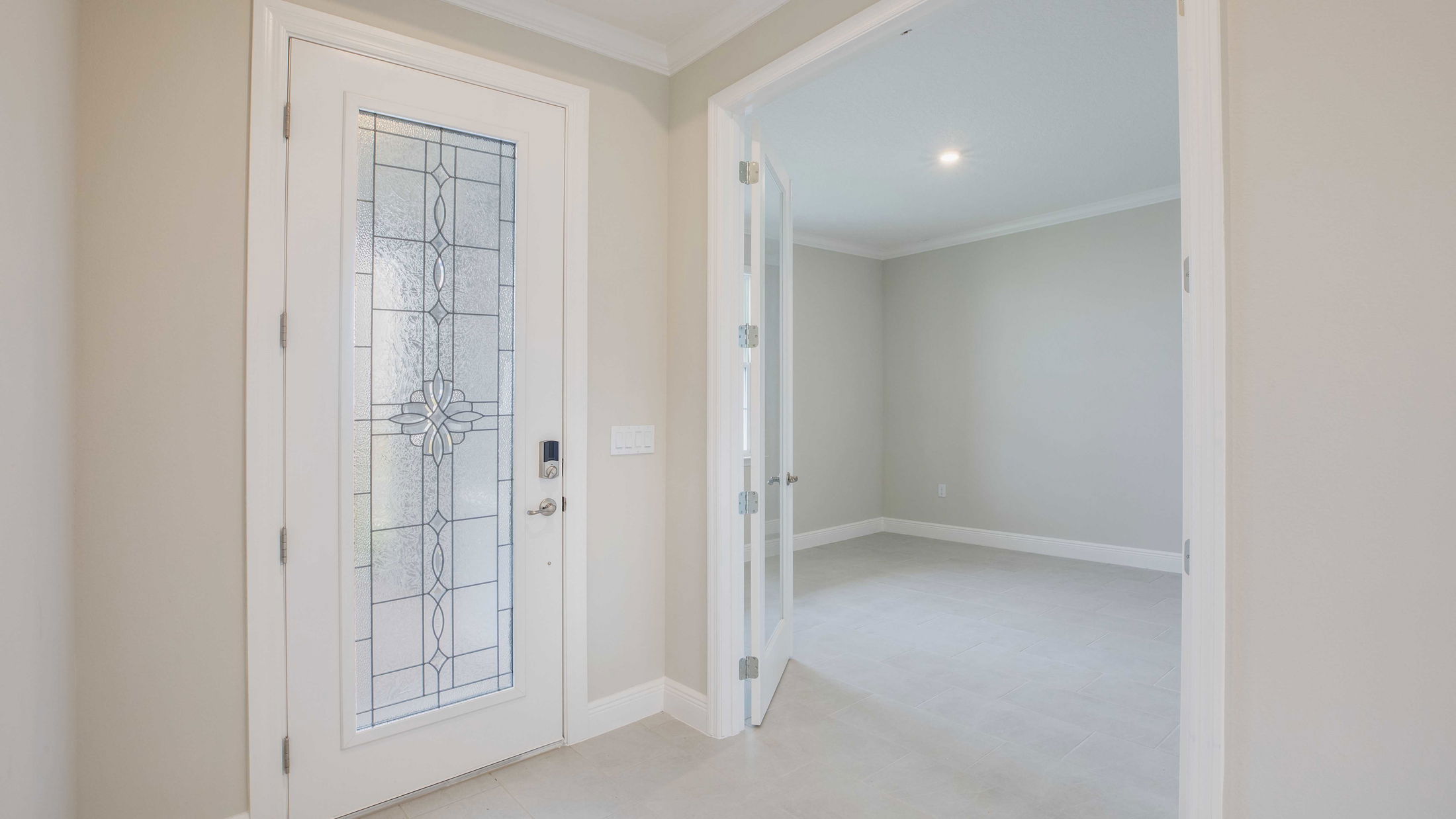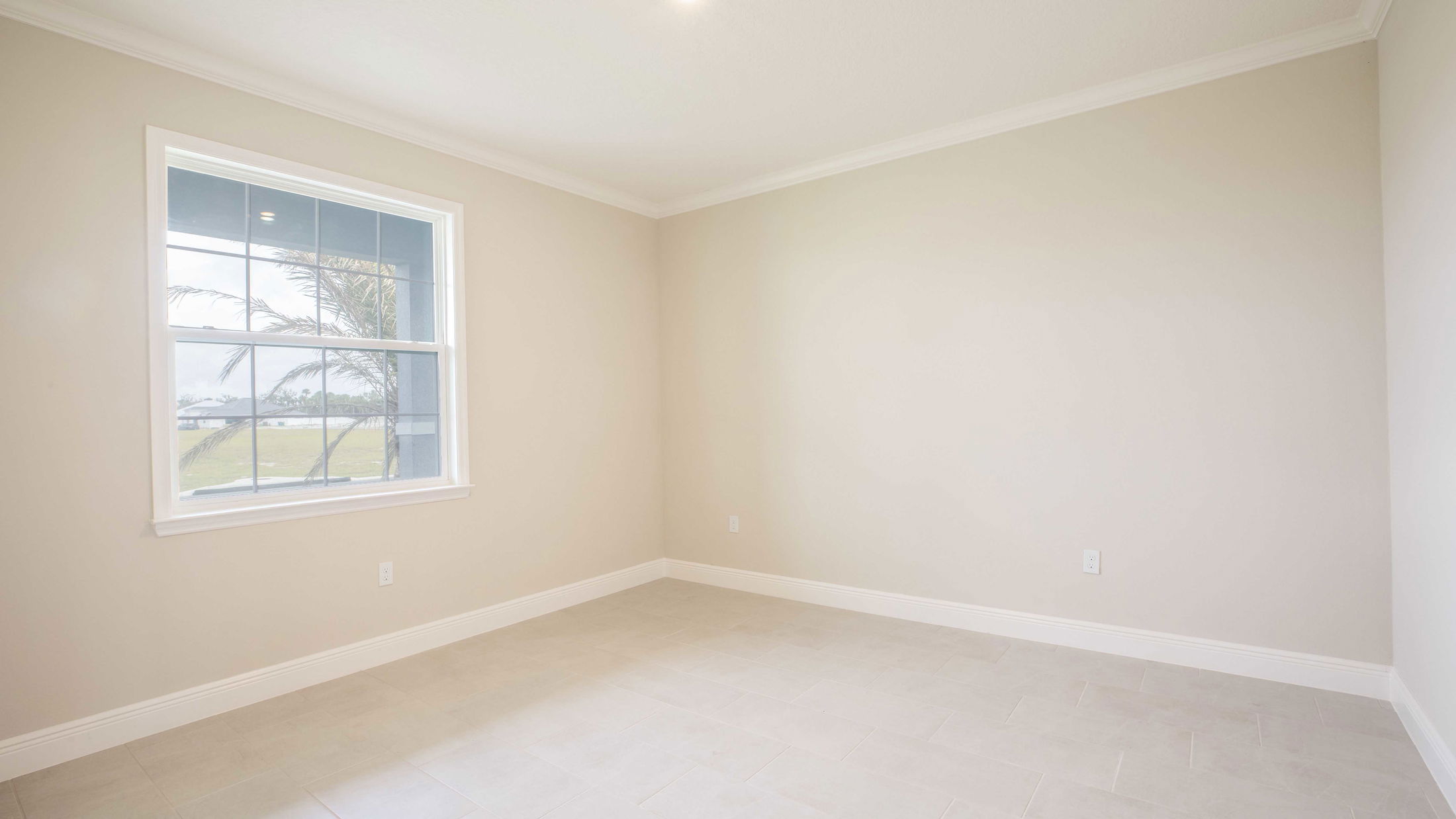 Spacious empty living room with beige walls, tile flooring, and large windows offering a view of a grassy yard.