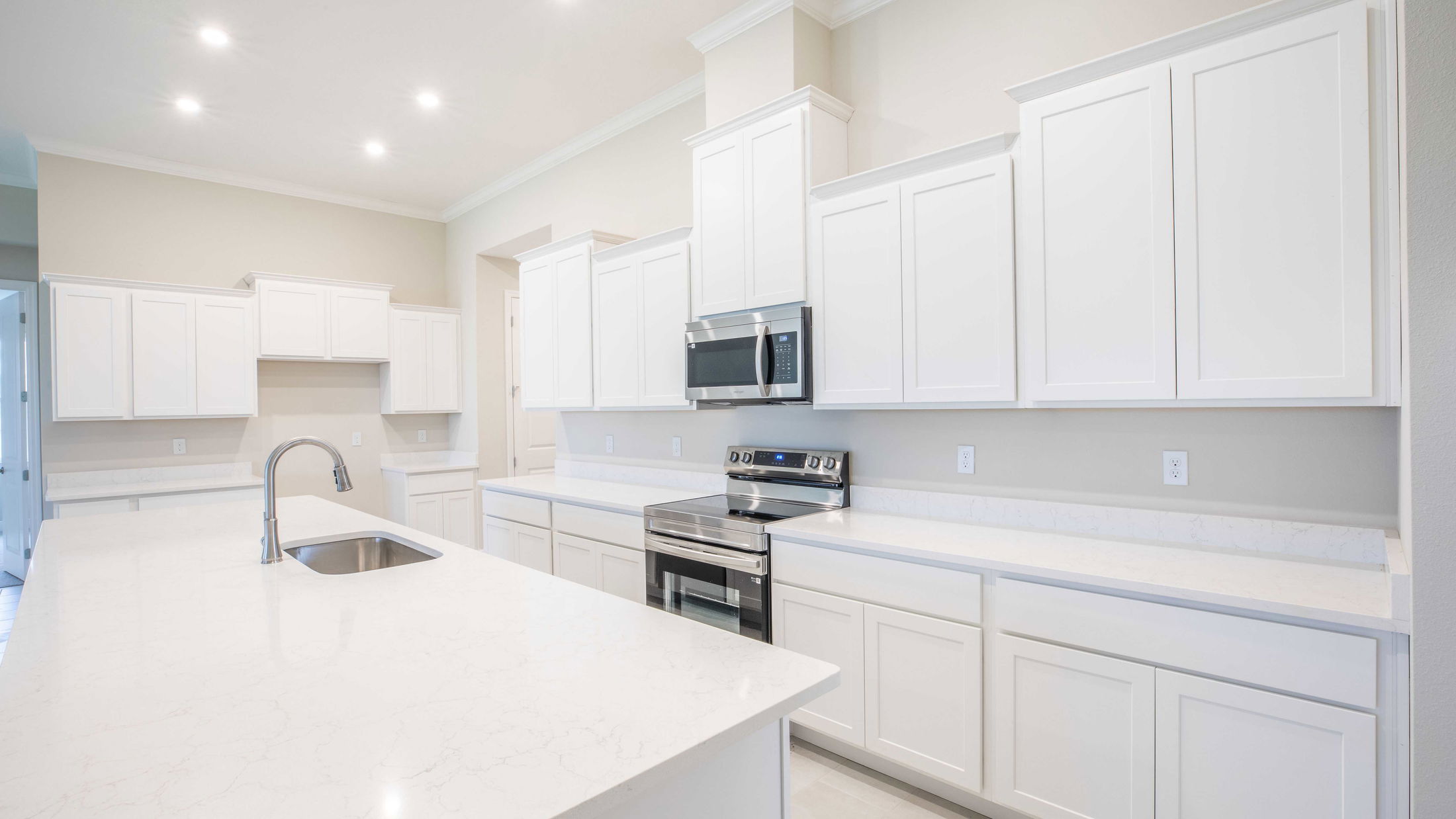 Modern kitchen with white cabinets, stainless steel appliances, and quartz countertops.
