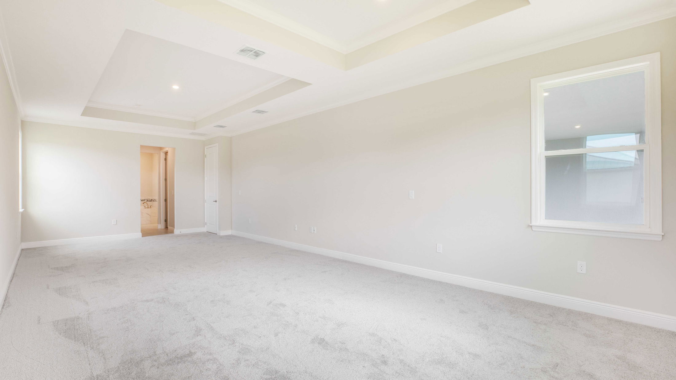 Spacious empty room with beige walls, carpet flooring, tray ceiling, and large windows showcasing a bright, natural landscape.