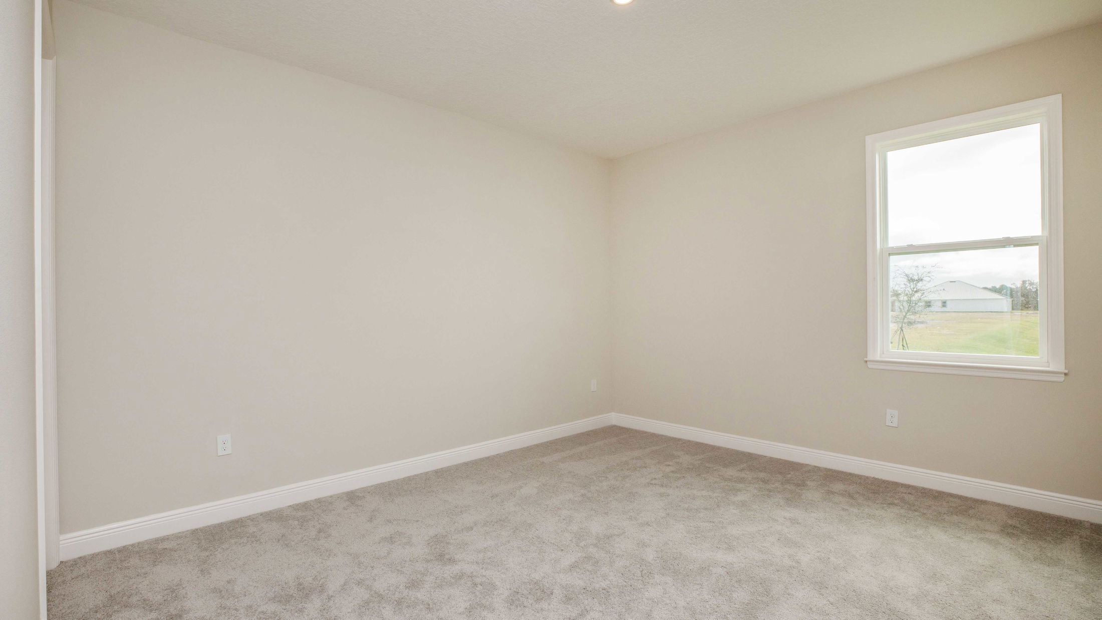 Empty beige room with clean carpeting and a single window, perfect for home staging or real estate showcase.