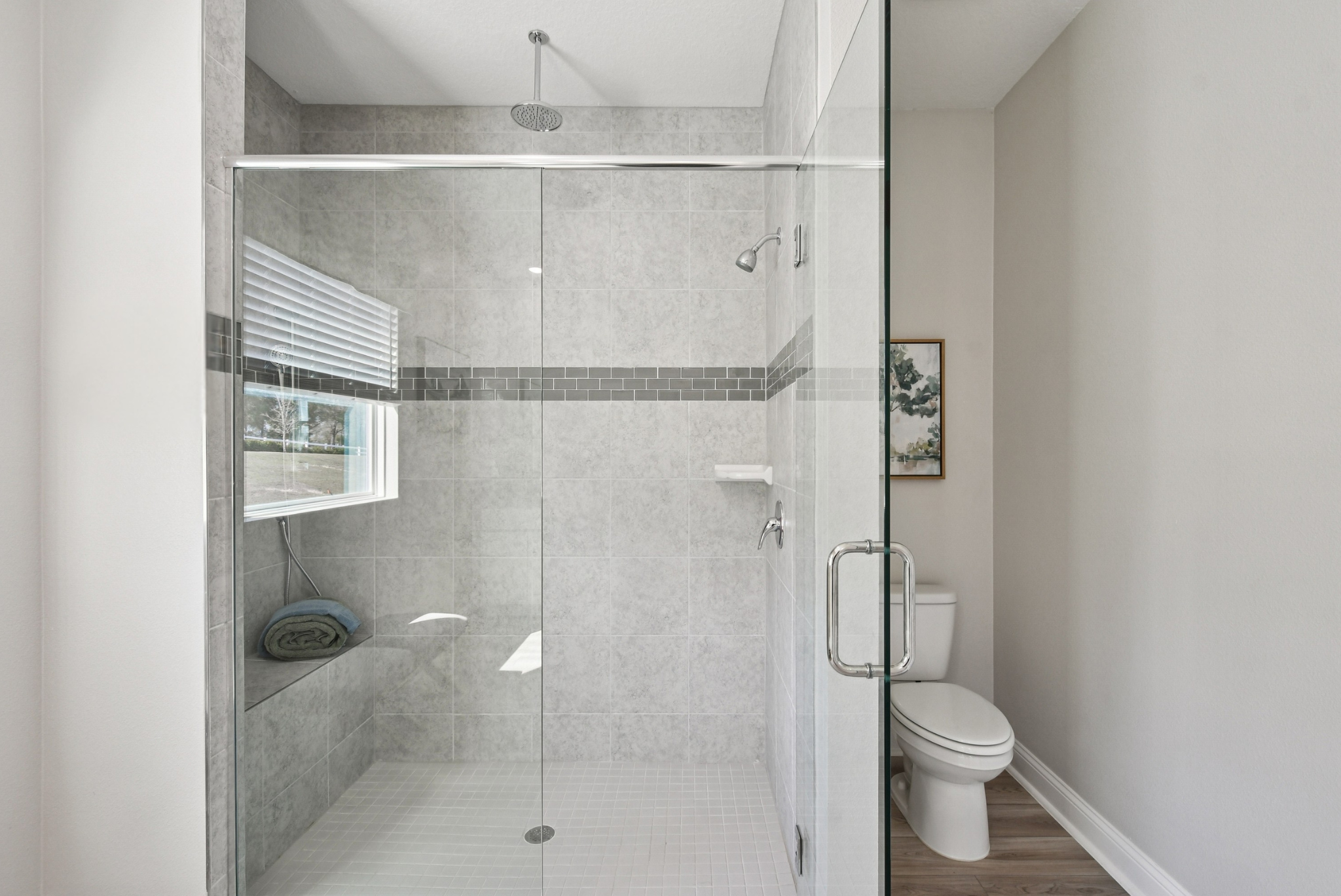 Modern bathroom with tiled walk-in shower, decorative wall art, and a cushioned bench under a window with blinds.