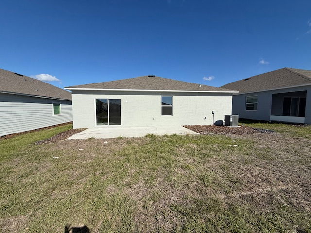 Backyard view of a modern single-story house with a patio and grass lawn under a clear blue sky.