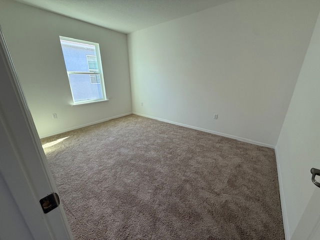 Empty, sunlit room with beige carpet and a window overlooking a construction site.