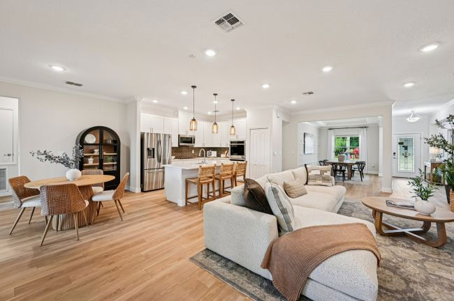 Modern open-concept interior with wood-look tile flooring, recessed lighting, and neutral wall colors.