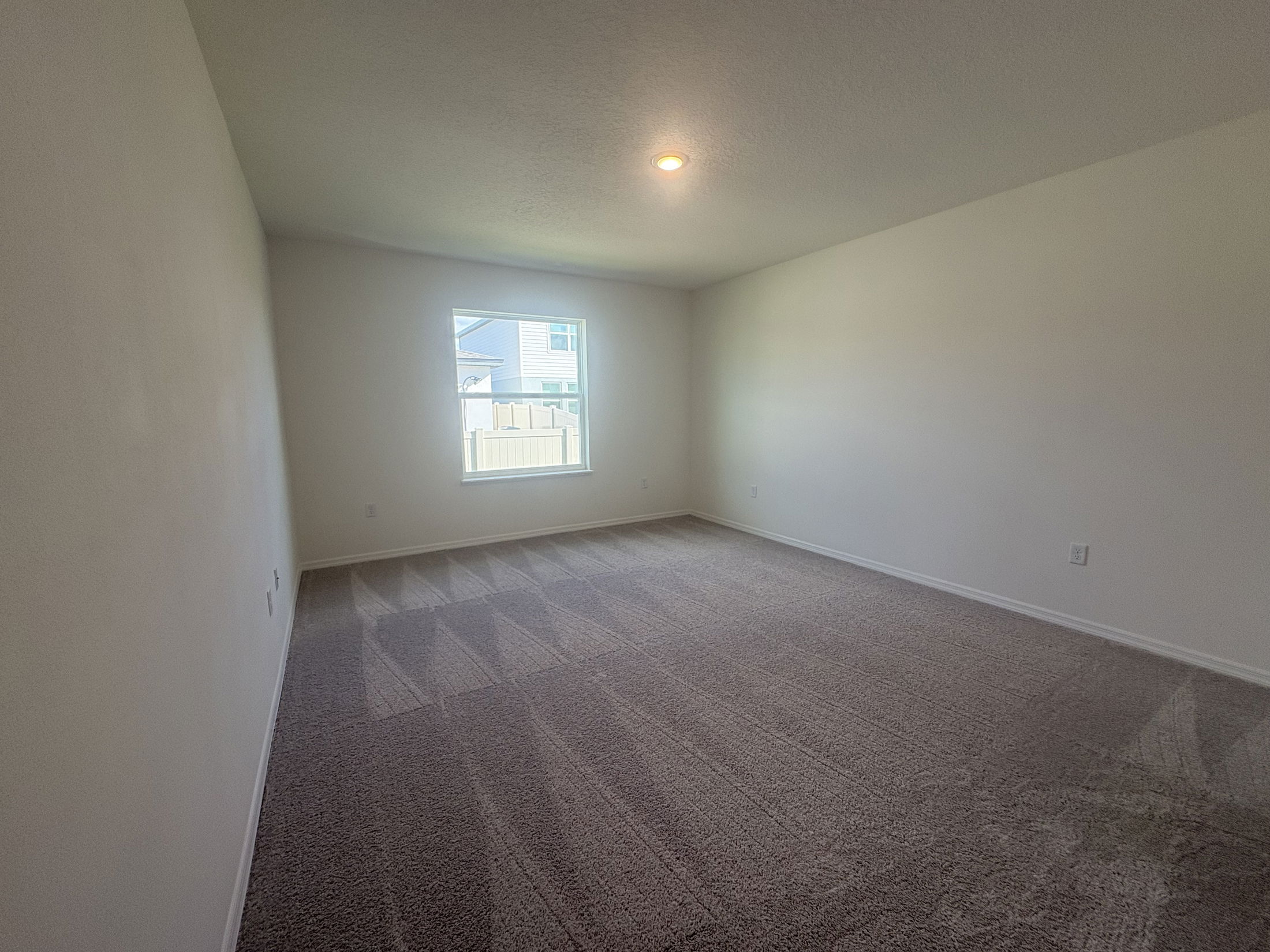 Empty room with beige carpet and a large window, featuring white walls and ceiling.