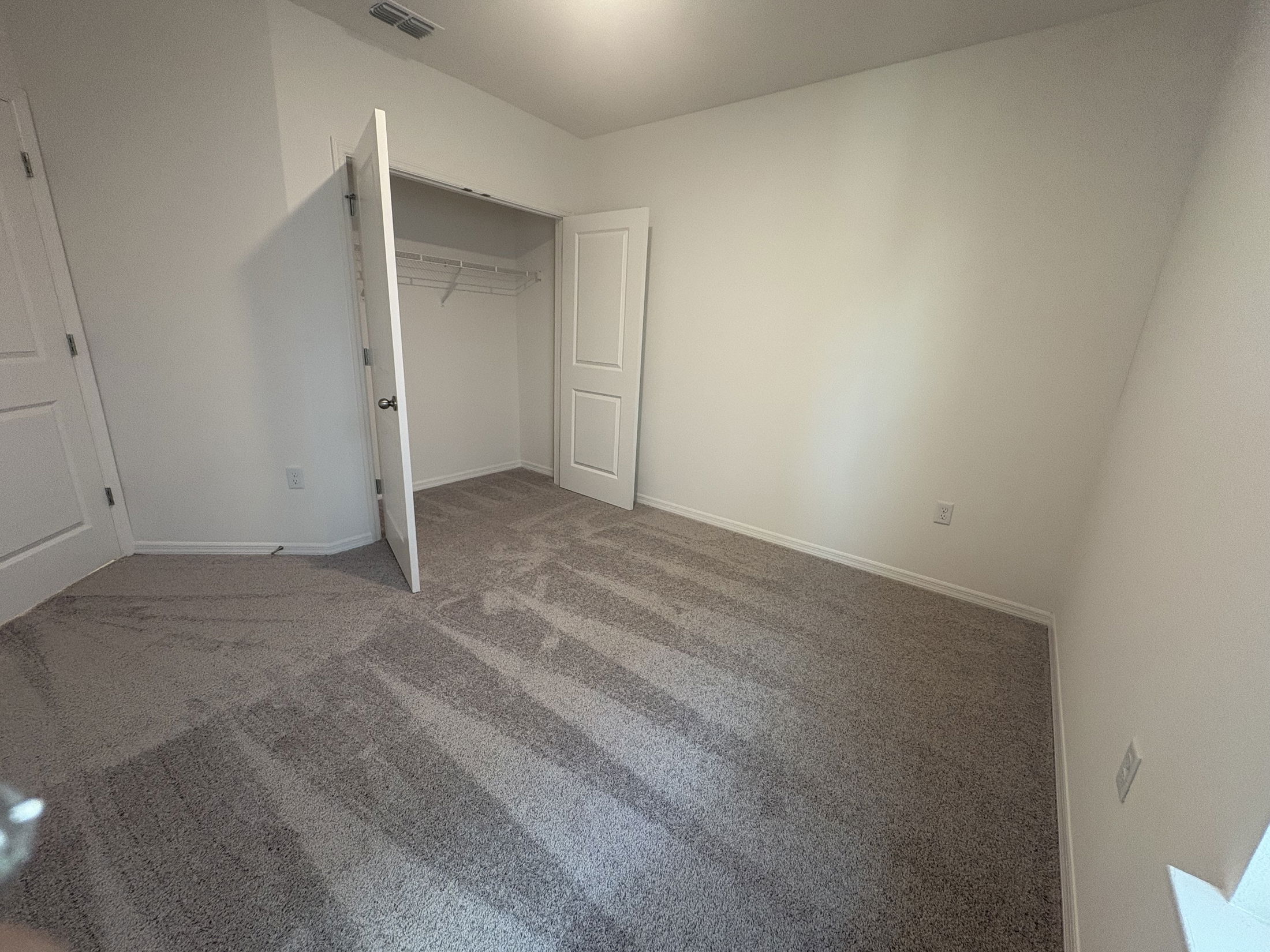 Empty room with gray carpet, white walls, a closed closet, and an open door leading to a tiled hallway.