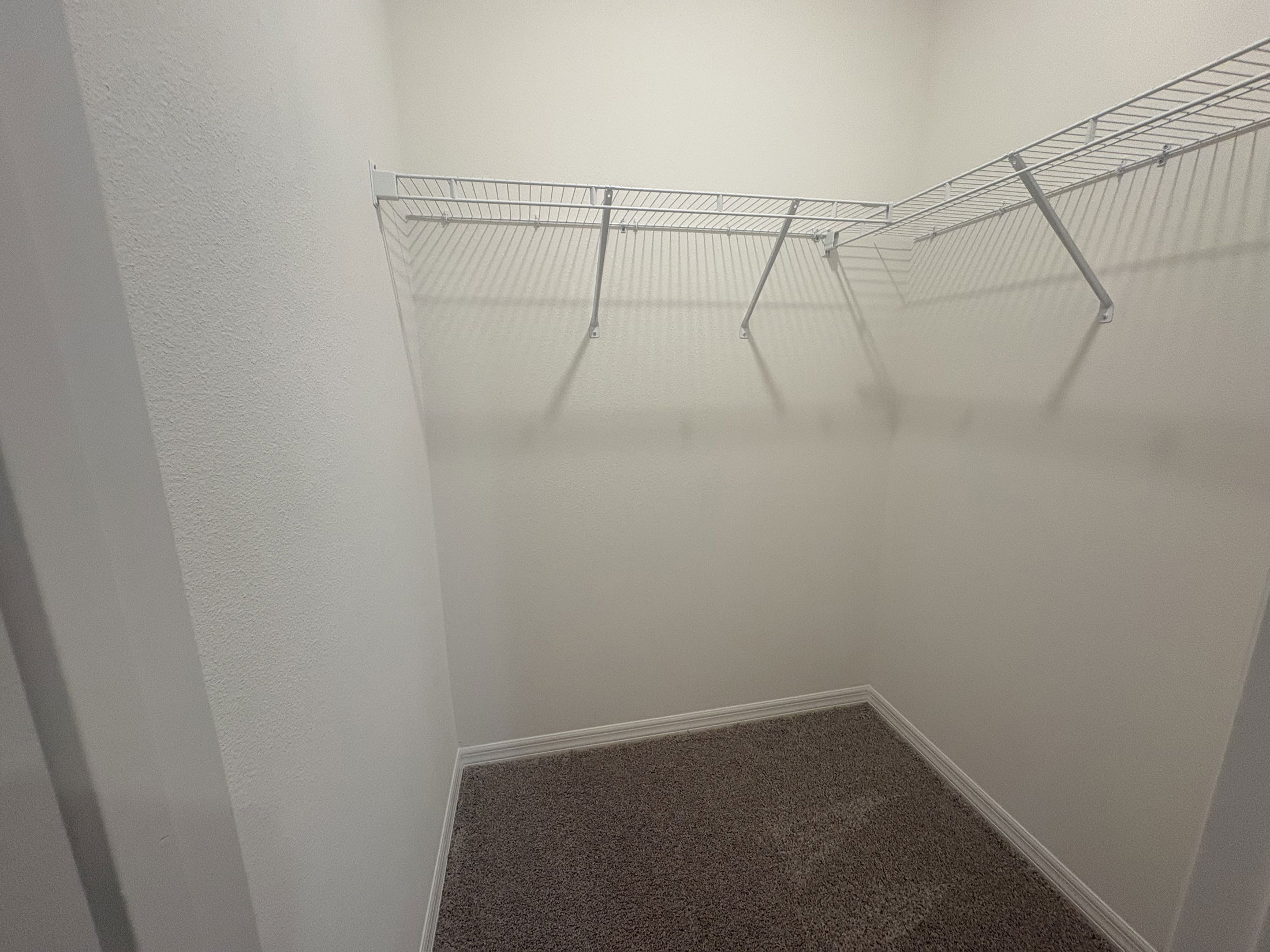 Empty walk-in closet with carpet flooring and wire shelving on white walls.