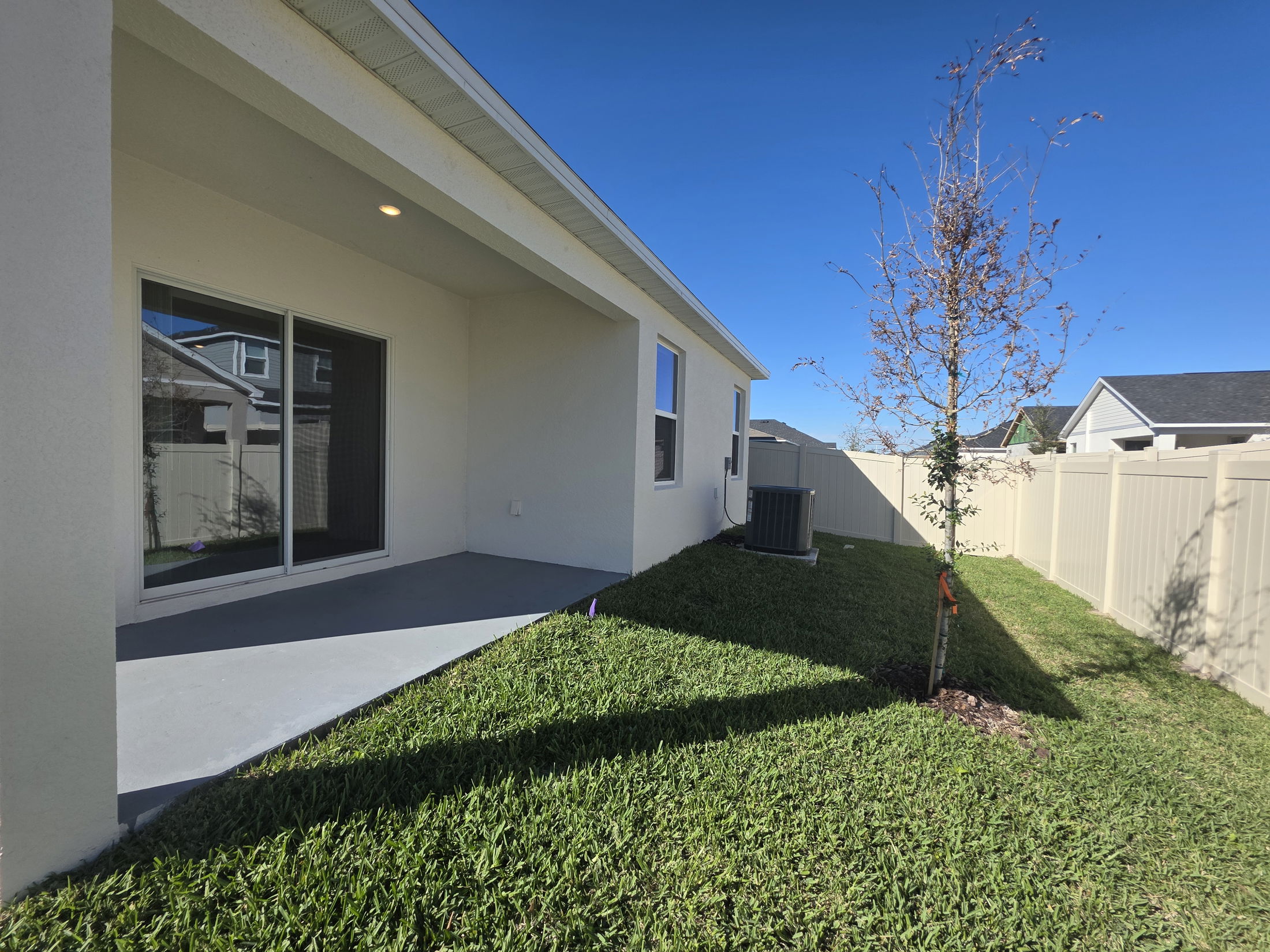 Covered backyard patio area of a modern house with sliding glass doors under a blue sky.
