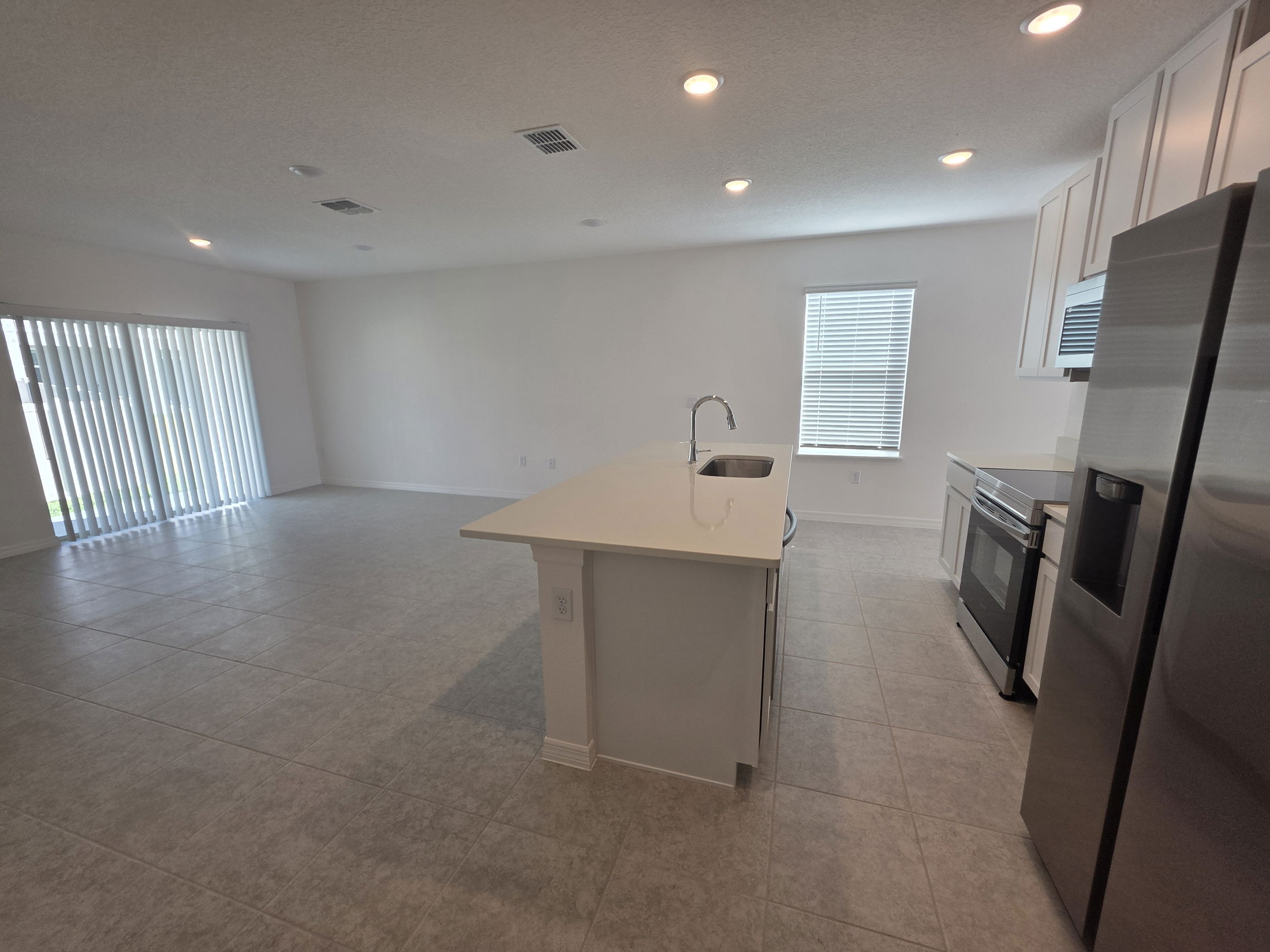 Modern kitchen with a central island, stainless steel appliances, and open floor plan leading to a bright living area with sliding glass doors.