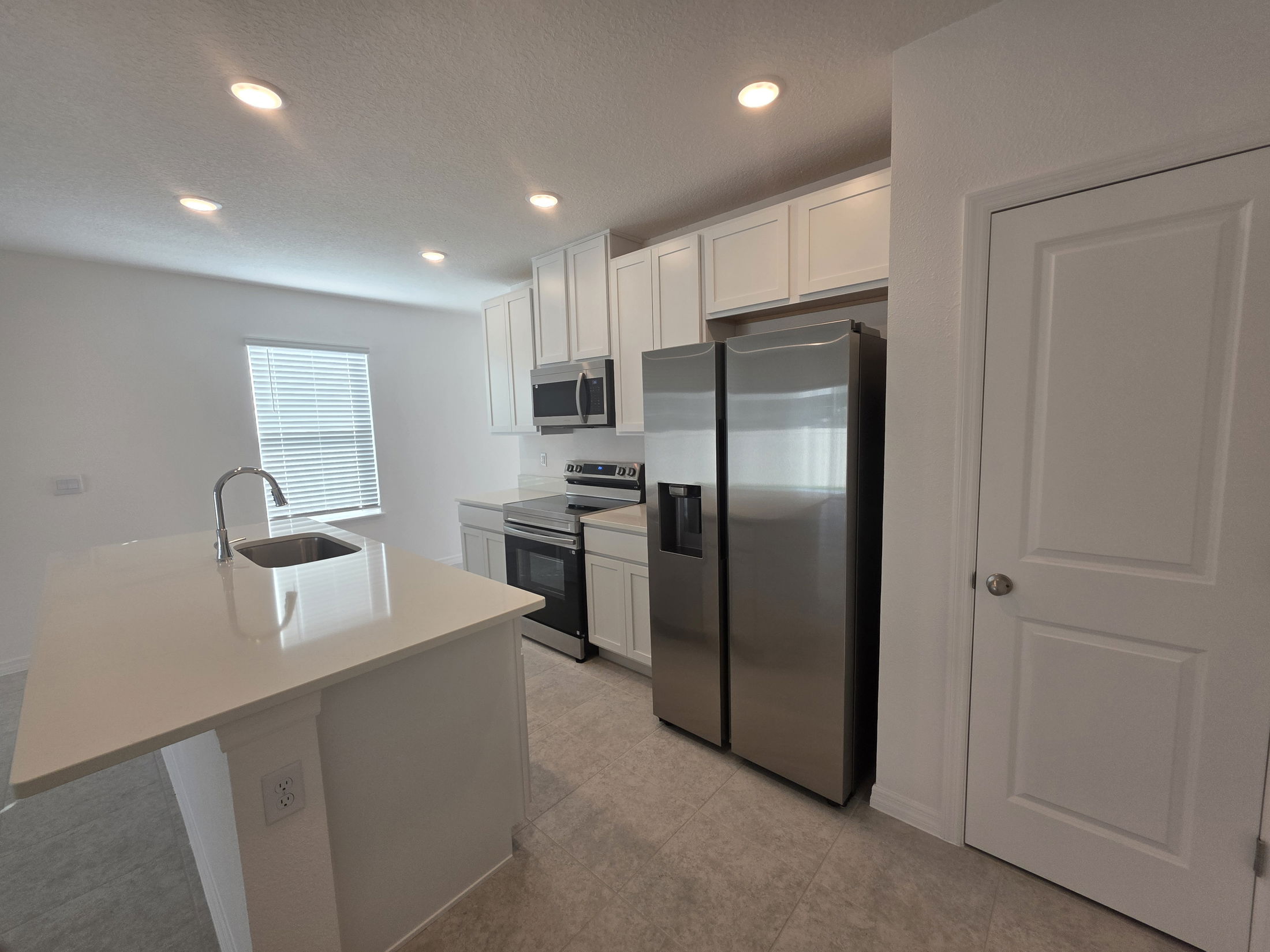 Modern white kitchen with stainless steel appliances, granite countertops, and bright natural light.