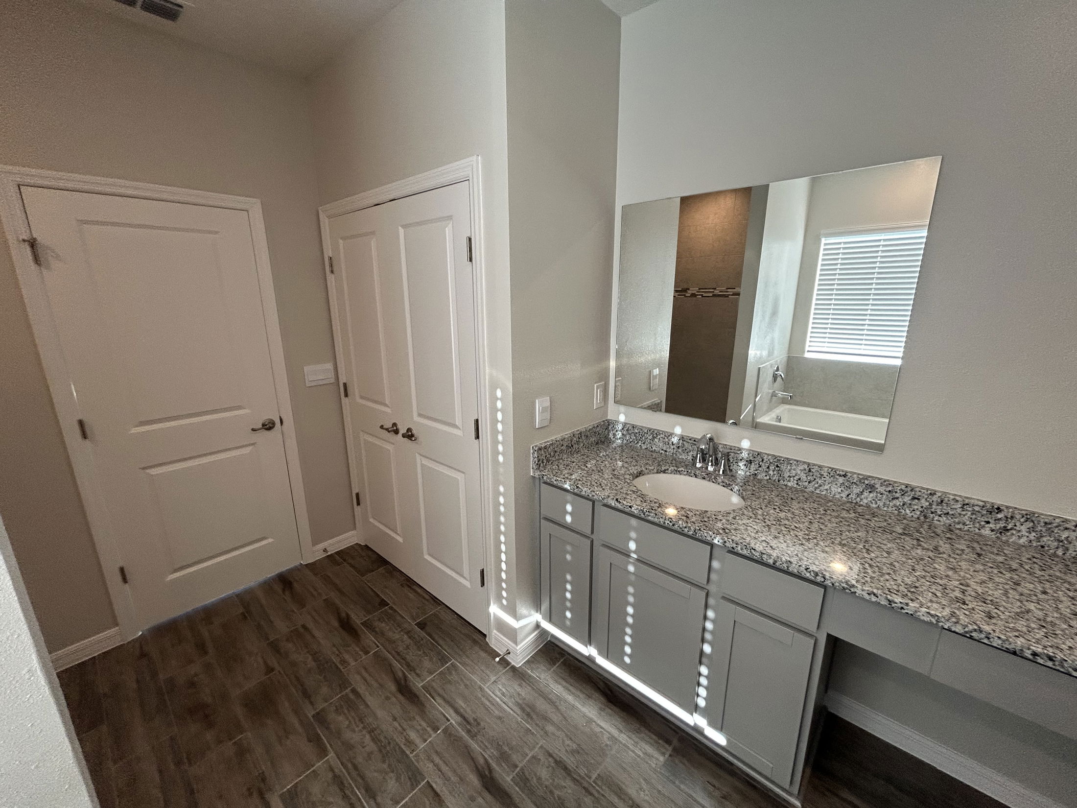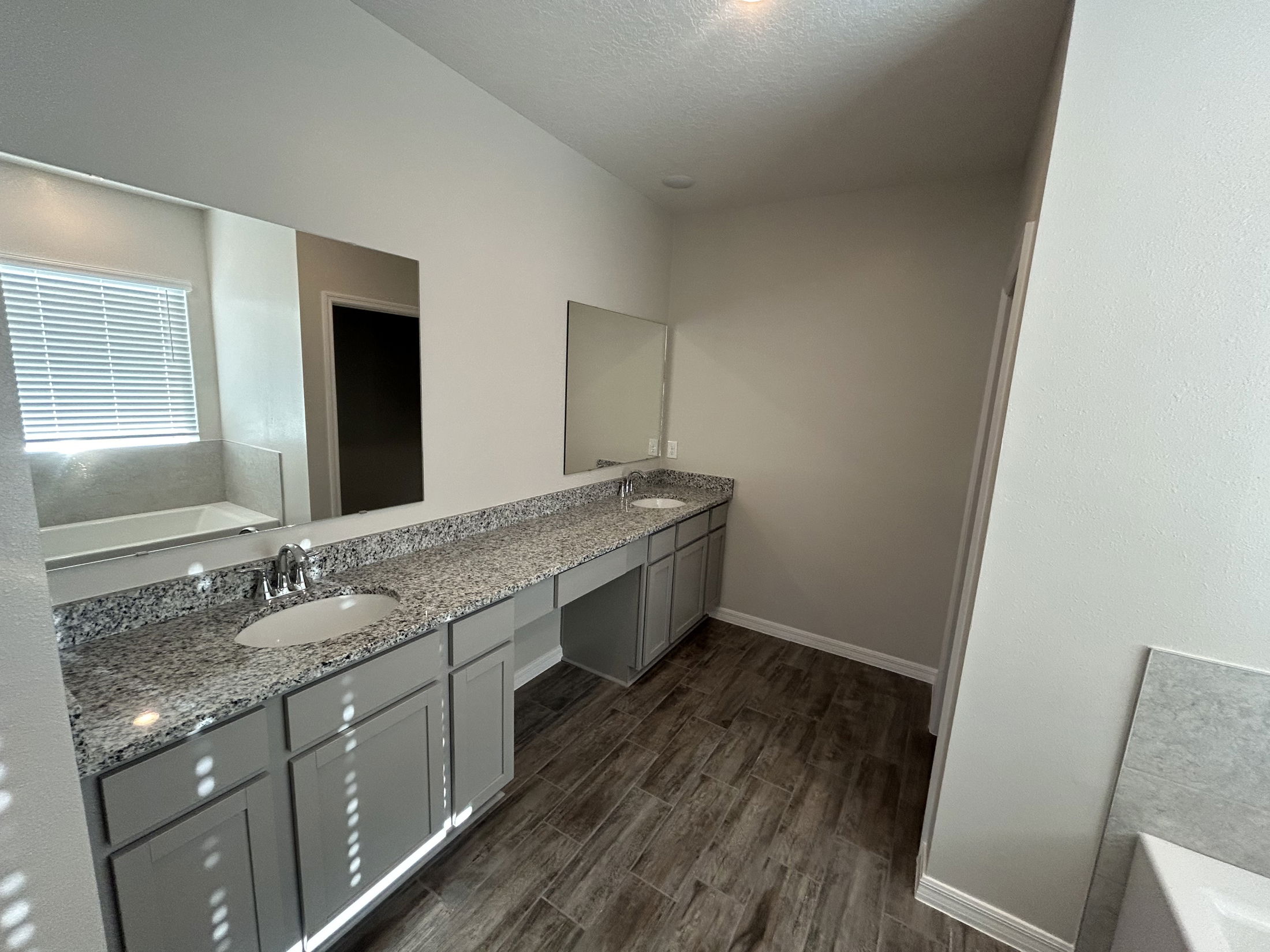 Modern bathroom featuring a tub, tiled walls, and a granite countertop with a mirror.