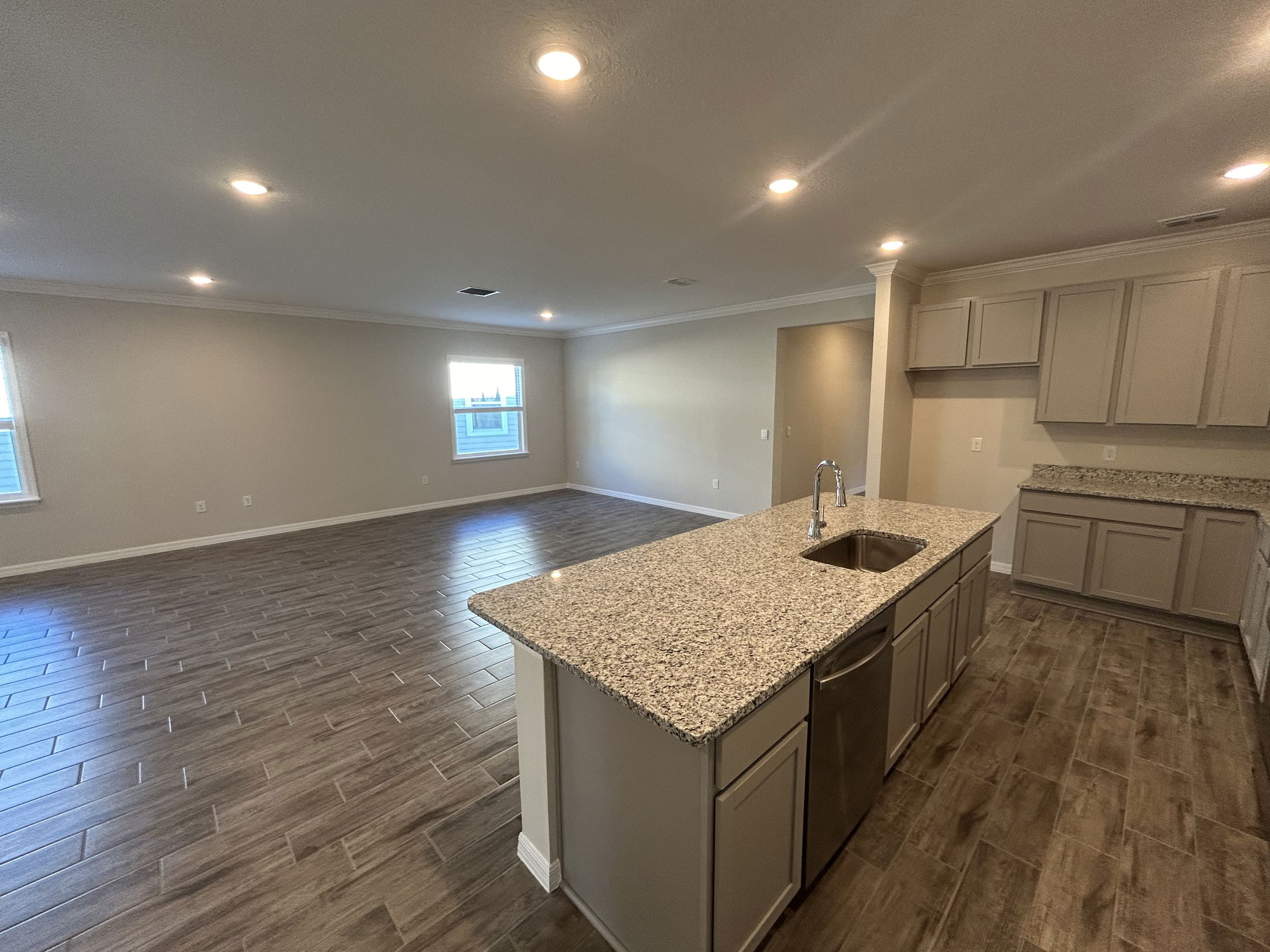 Spacious living room with beautiful wooden tile flooring and large windows for natural light.