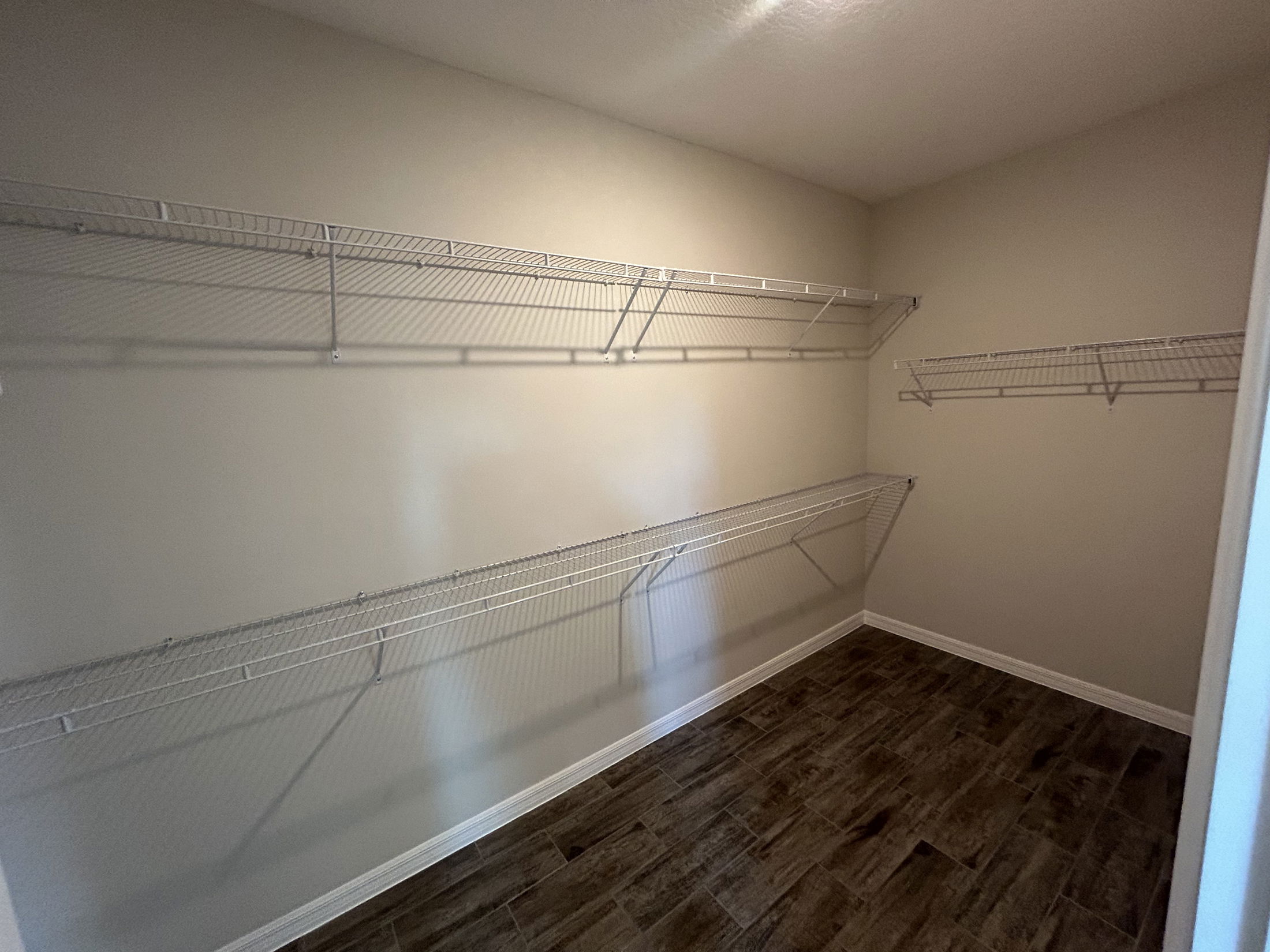 Empty walk-in closet featuring wire shelving and wood-style flooring.