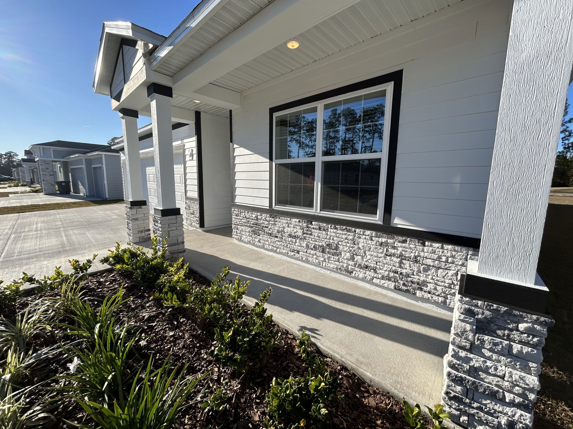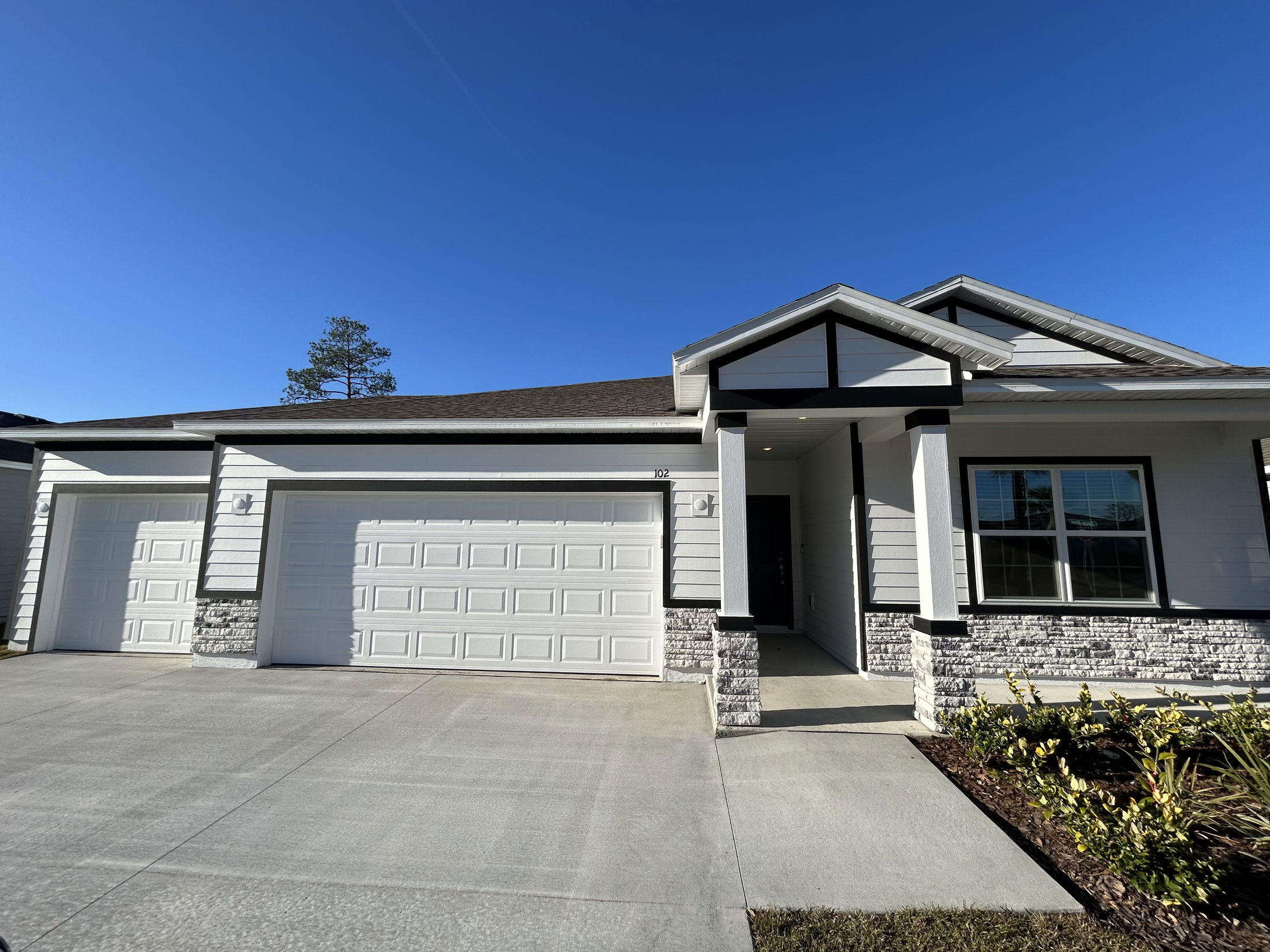 Facade of a modern single-family home with white siding, stone accents, and a double garage under a clear blue sky.