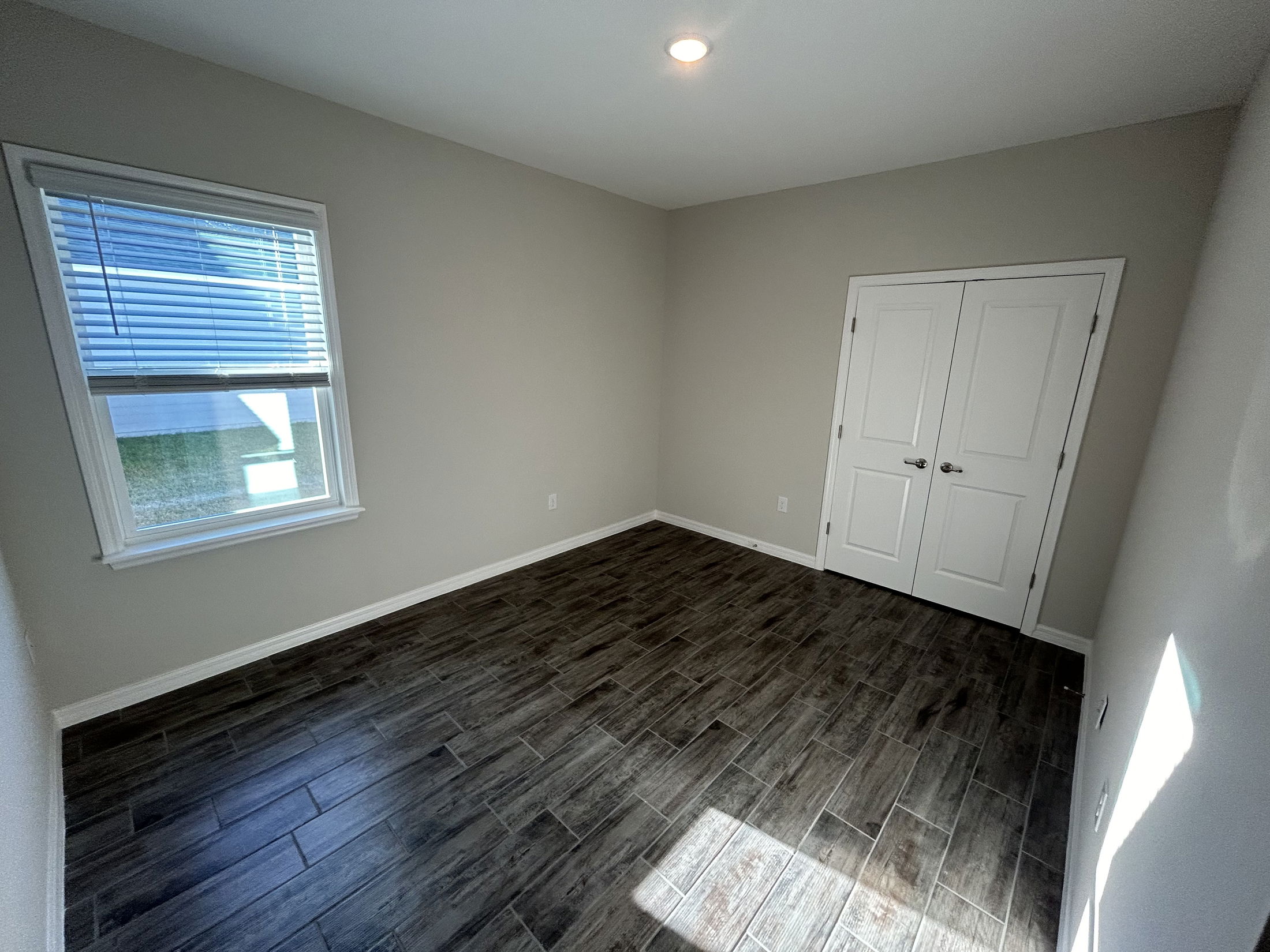 Bright and spacious empty room with light-colored walls, large window, and wood-like tile flooring.