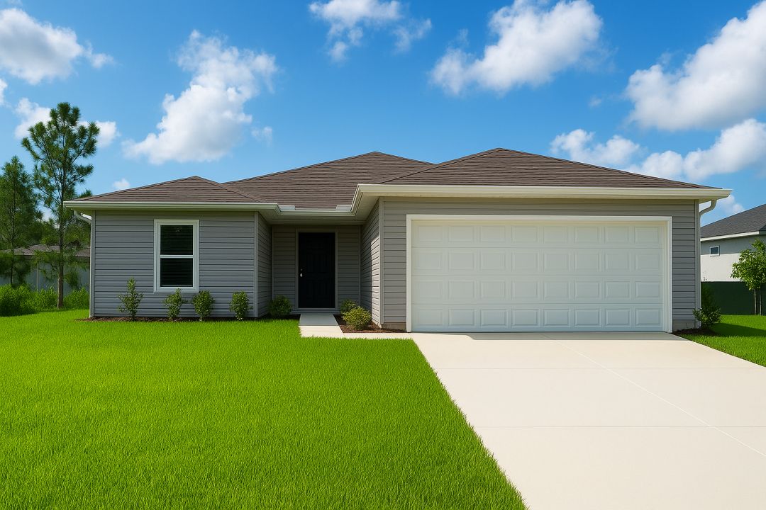 Single-story suburban house with a gray exterior, double garage, lush green lawn, and clear blue sky.