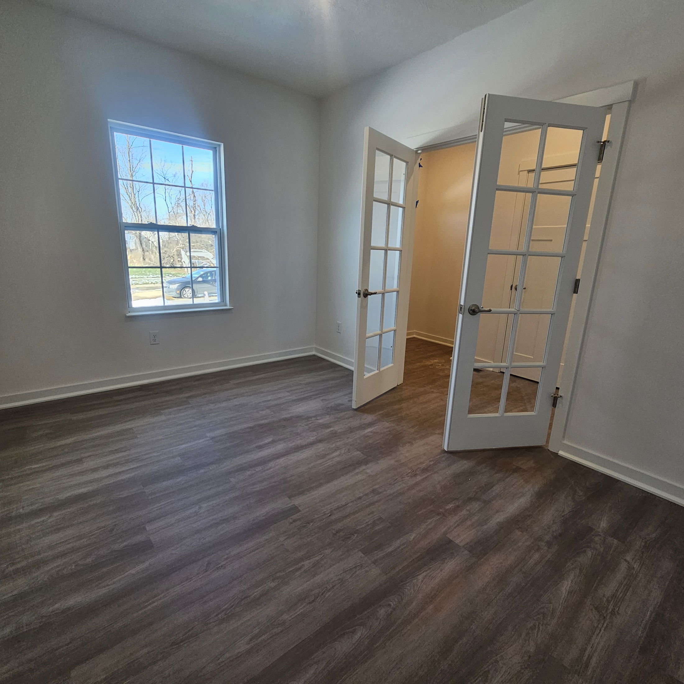 Enjoy a spacious 16' x 6' front porch, perfect for relaxing or greeting guests. Inside, an open front room and foyer welcome you, with elegant double glass doors that can close off the space to create a private den when needed.