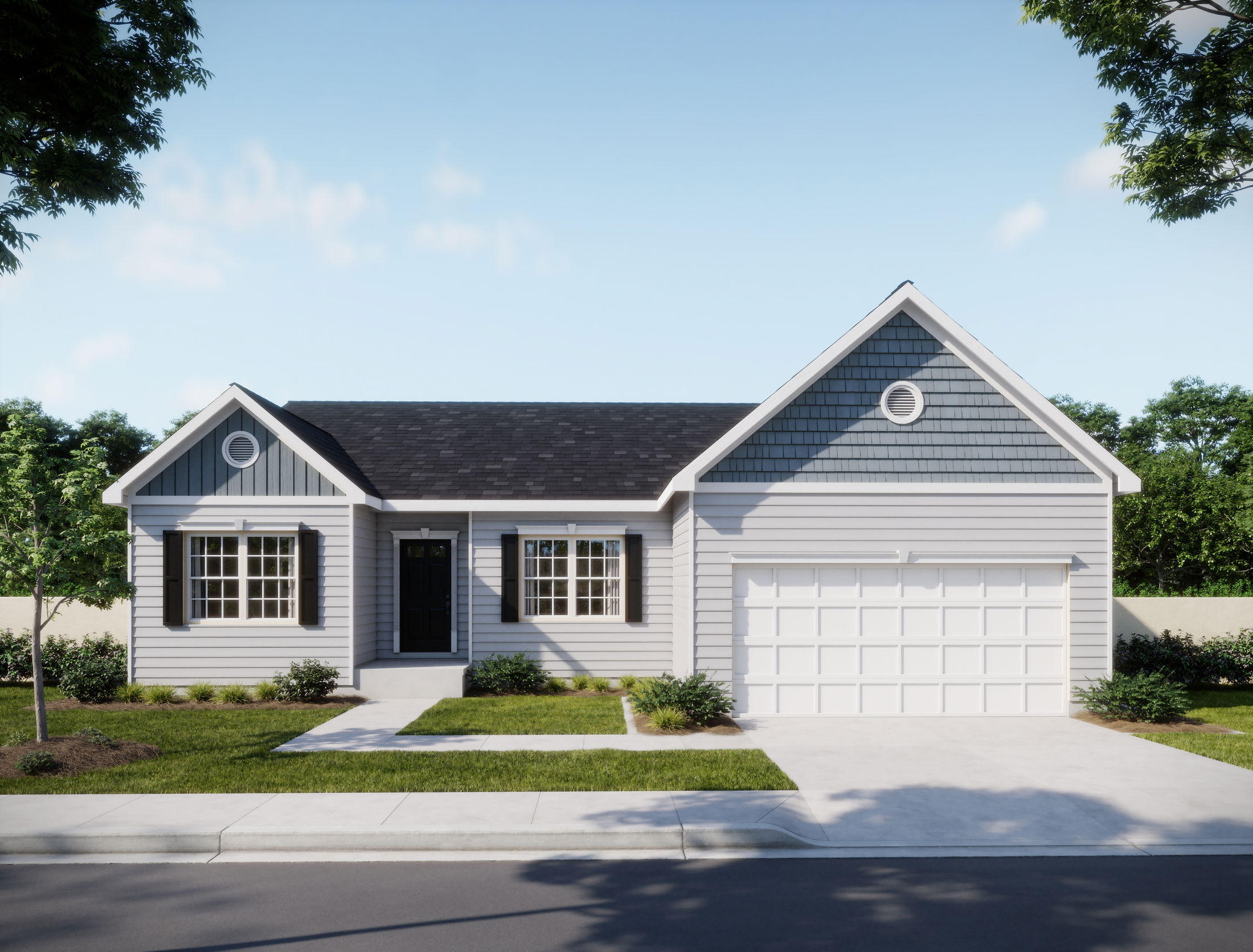 Charming single-story suburban house with stone and siding facade, black roof, and attached two-car garage on a sunny day.