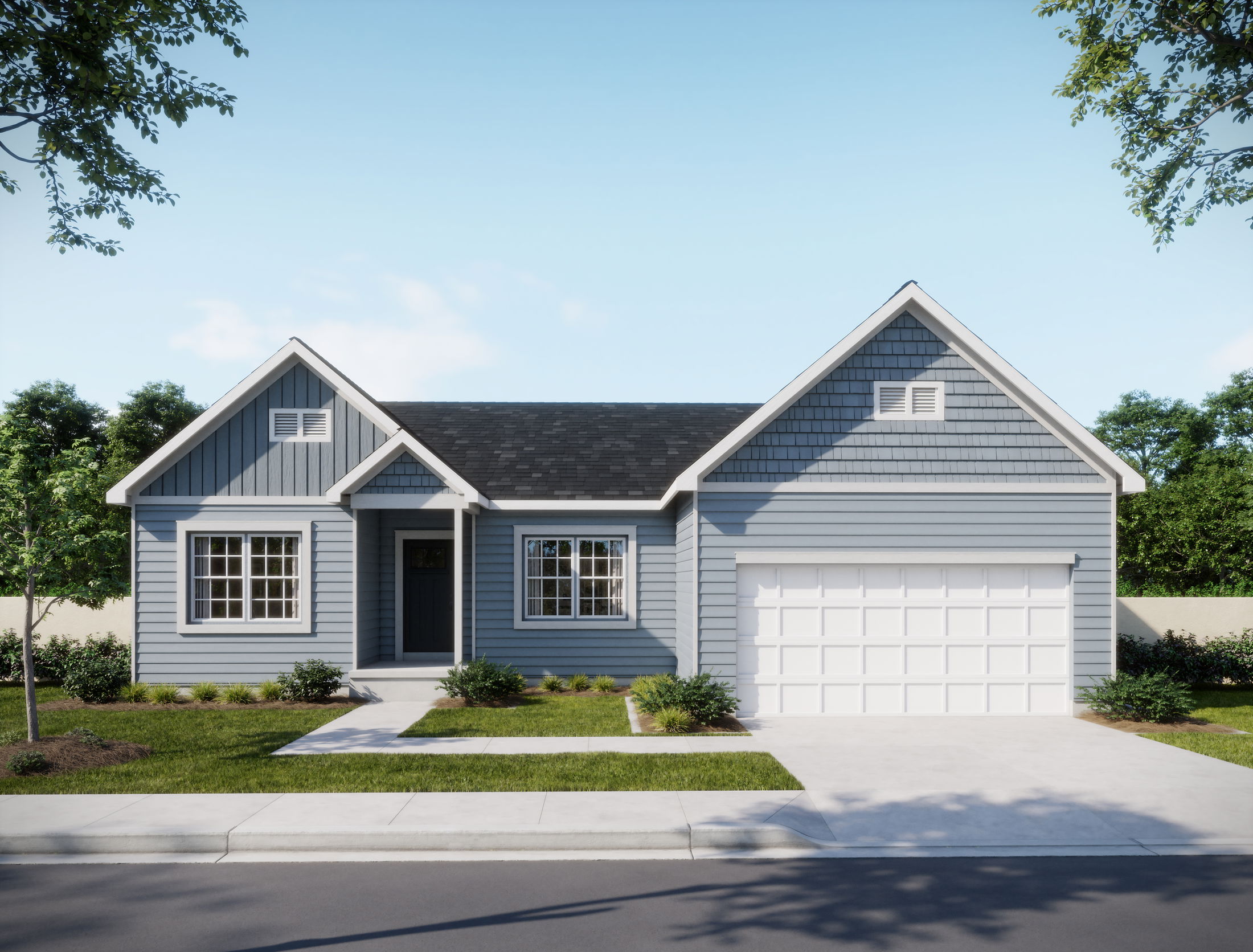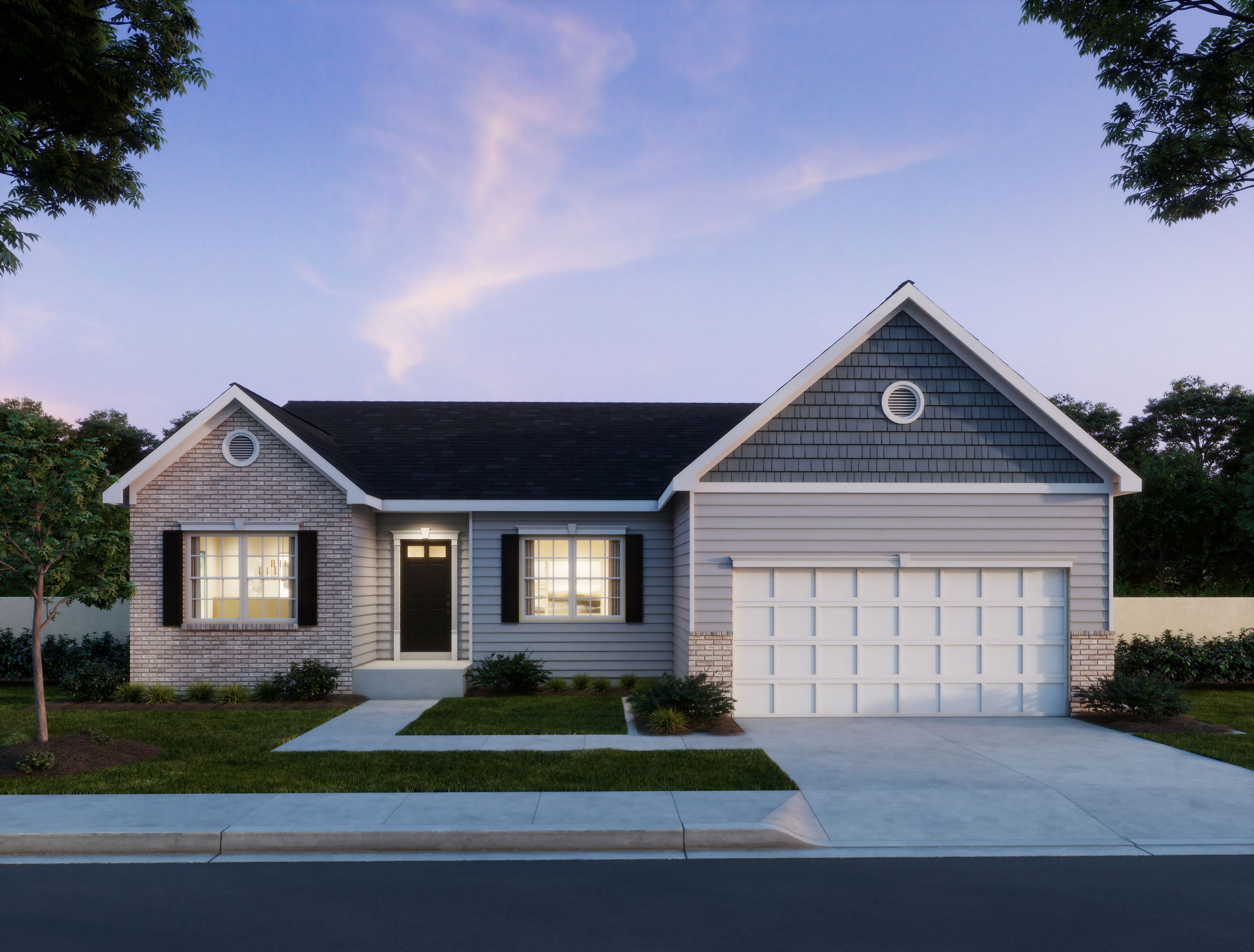 Single-story blue house with brick accents, white garage doors, and a manicured lawn, set against a twilight sky.