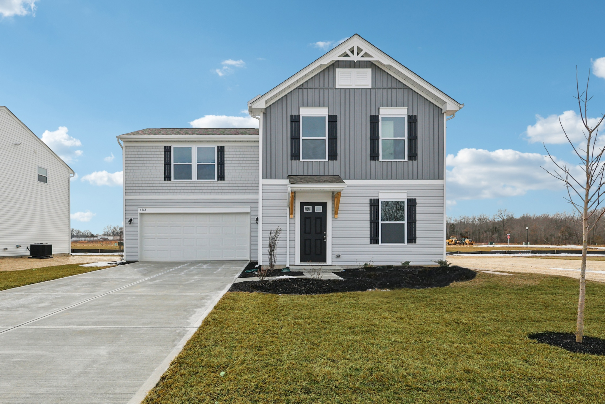Two-story modern home with gray siding, black shutters, and a garage, situated on a landscaped front yard under a blue sky.