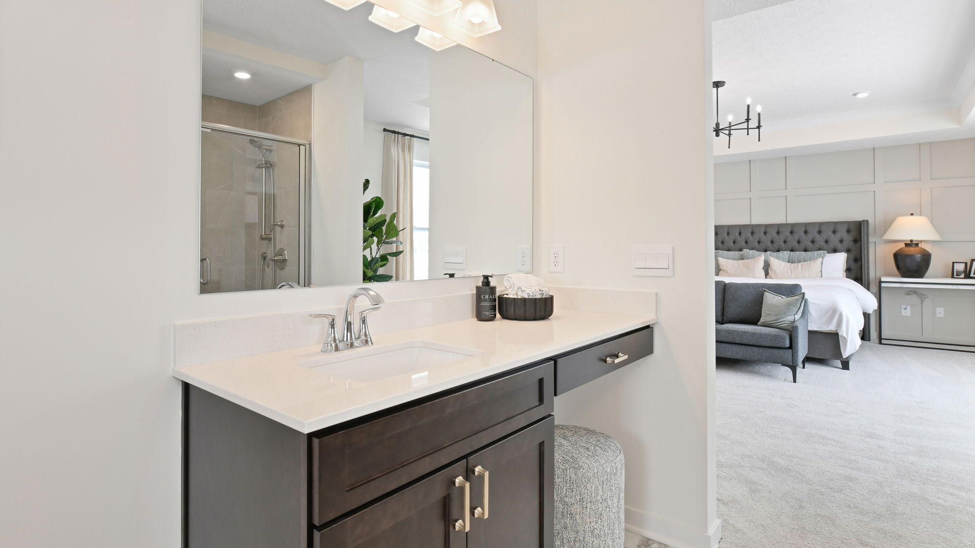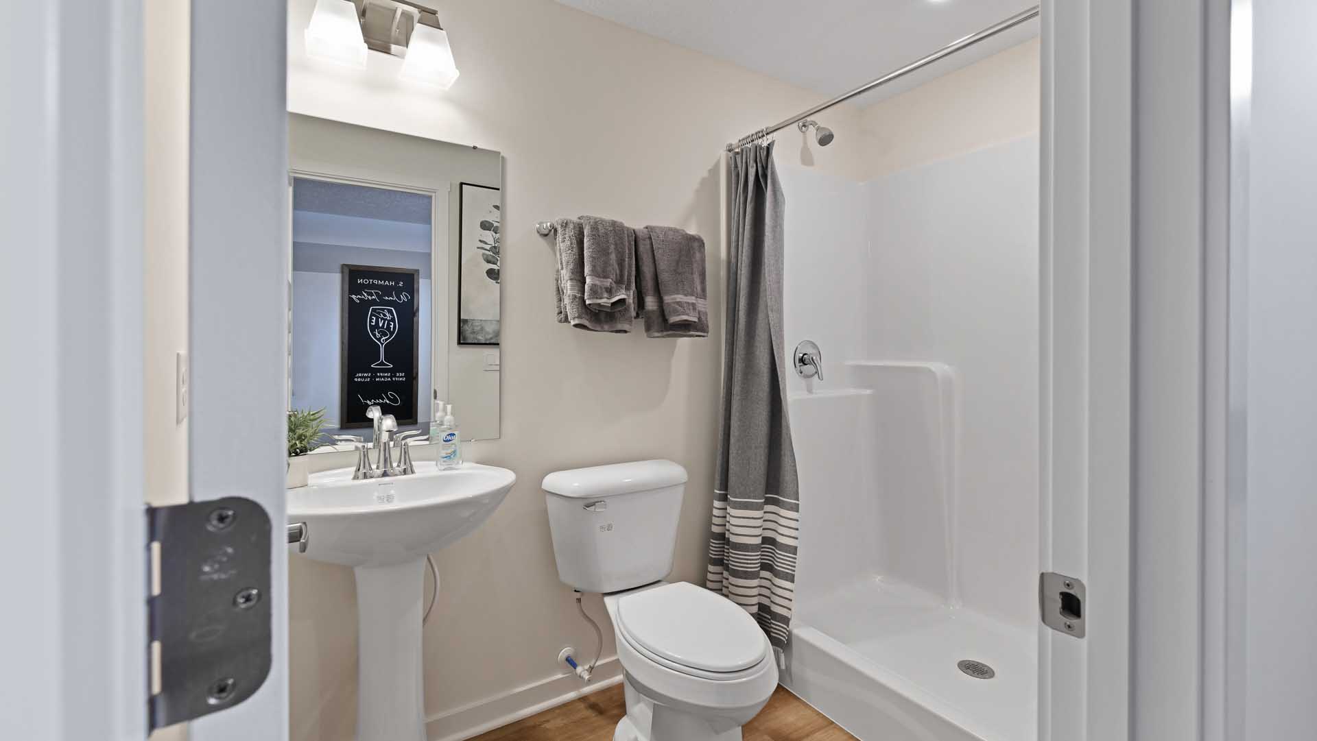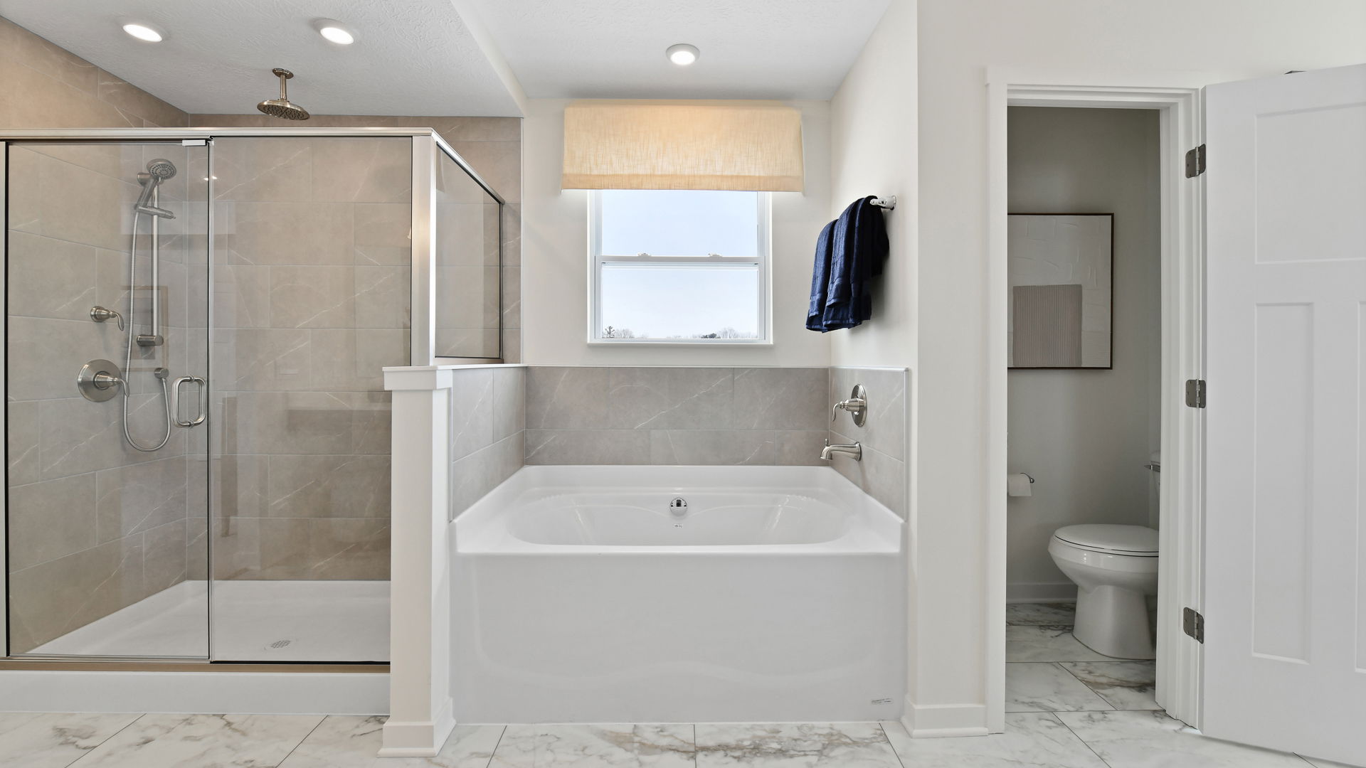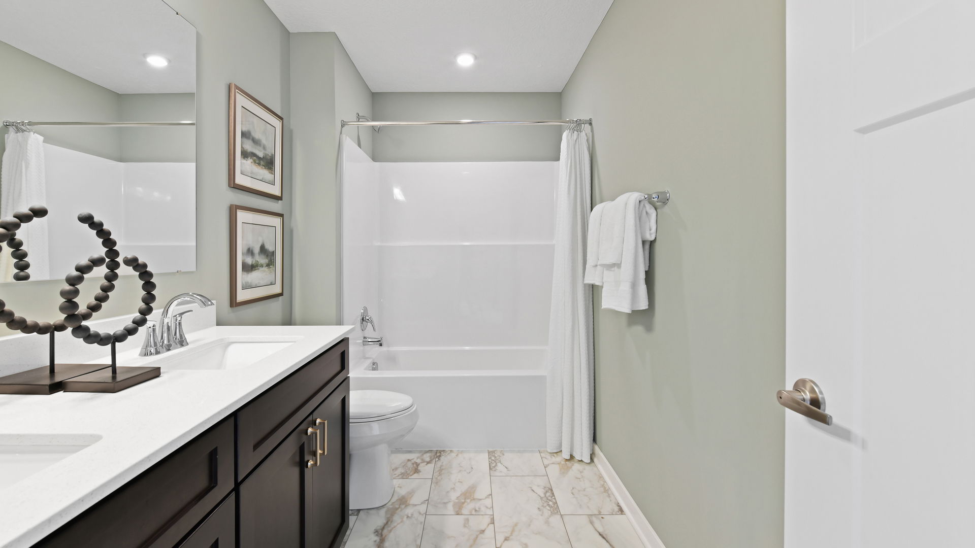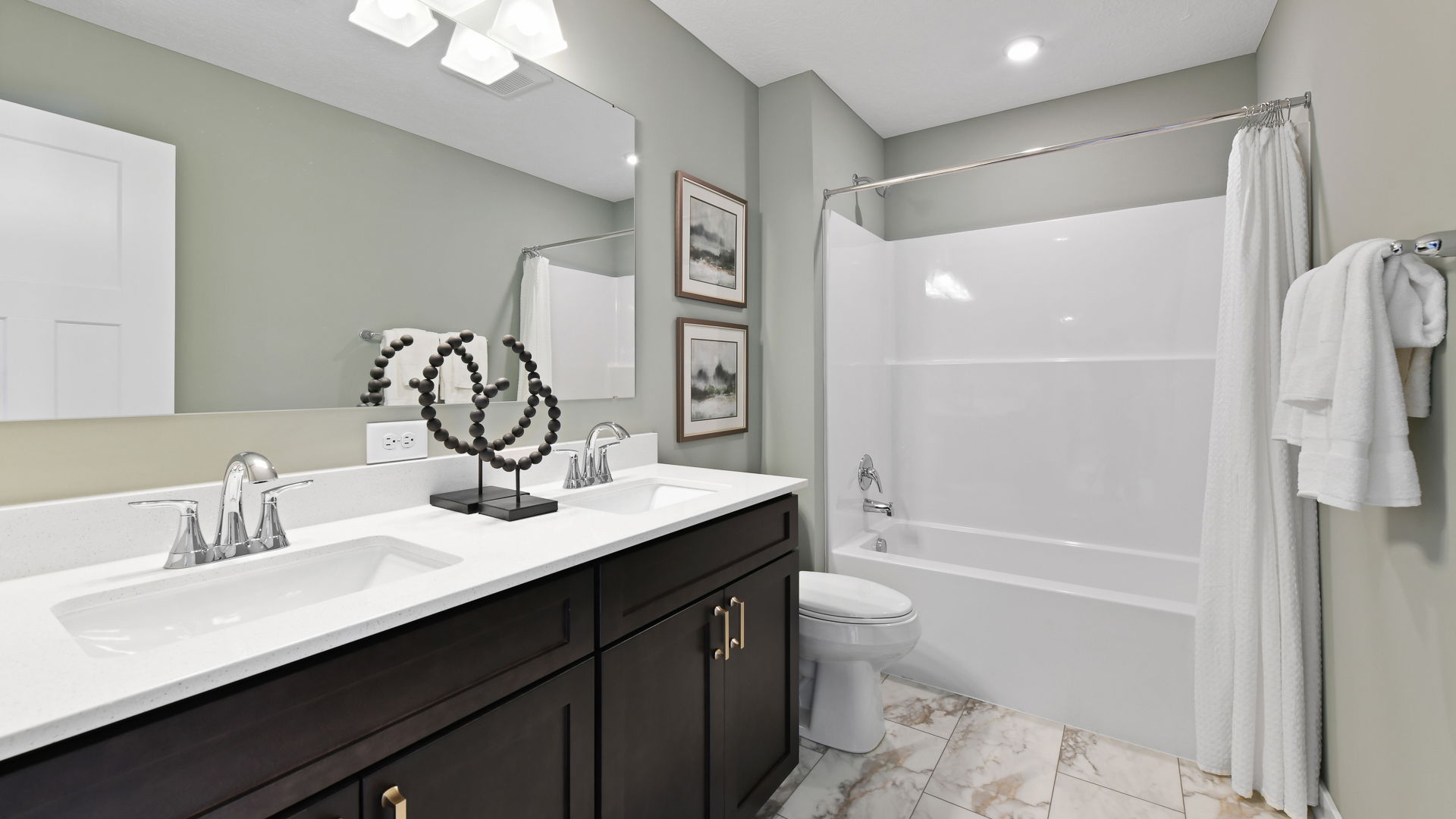 shower, a dual-sink vanity, and a private toilet area. The large second floor